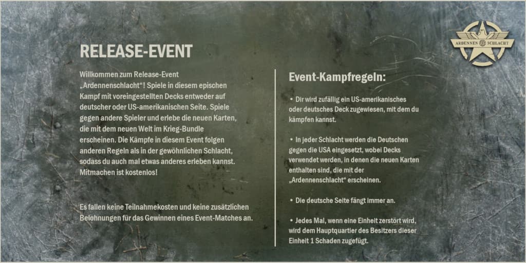Mit diesem Event kannst du alle neuen Ardenneschlacht-Karten kostenlos ausprobieren. Spiele einfach auf der Seite Deutschlands oder der USA.