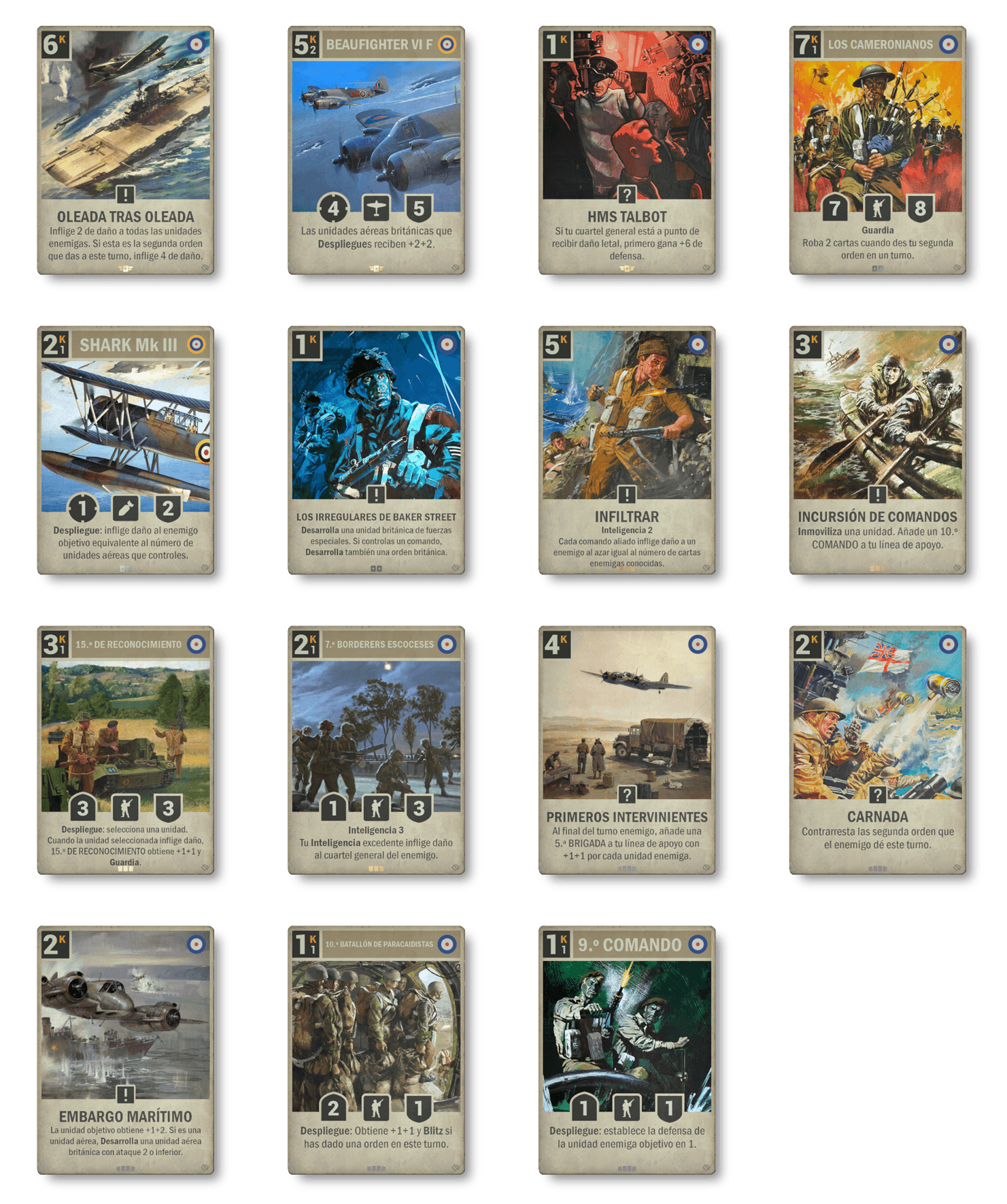 Durante la Segunda Guerra Mundial, Gran Bretaña desarrolló y utilizó frecuentemente las Unidades de Comando para el sabotaje, la infiltración y la interrupción de las operaciones enemigas. Para honrar esto, introducimos una nueva unidad de comando en KARDS y añadimos más cartas para elevar la temática de los comandos británicos al lugar destacado que se merece. En consonancia con el papel notable de la Fuerza Aérea Real (RAF) durante la Segunda Guerra Mundial, Gran Bretaña recibe también apoyo para su fuerza aérea. Además, un nuevo giro intrigante de jugabilidad le da apoyo a las segundas acciones de un mismo tipo (por ejemplo, la segunda orden dada durante un turno).