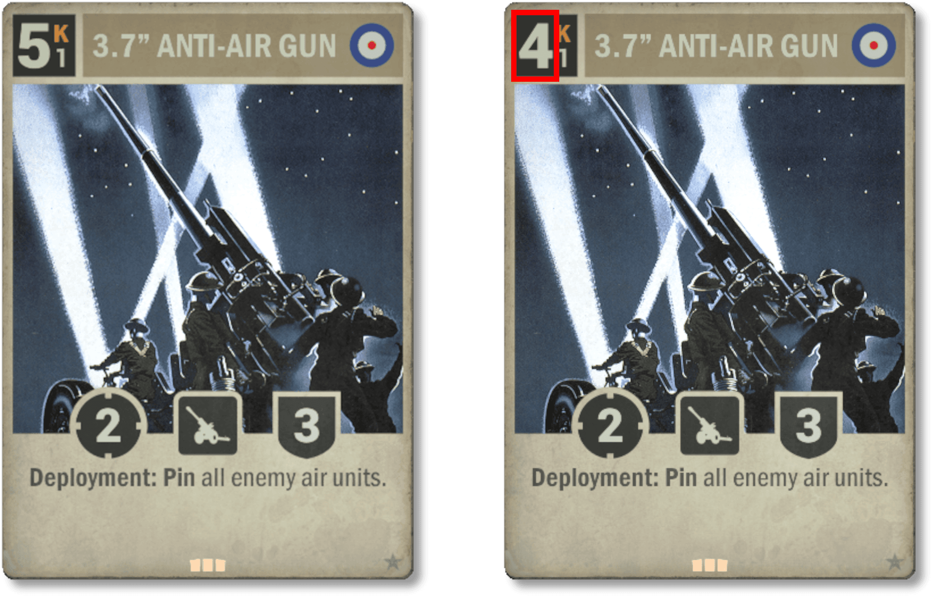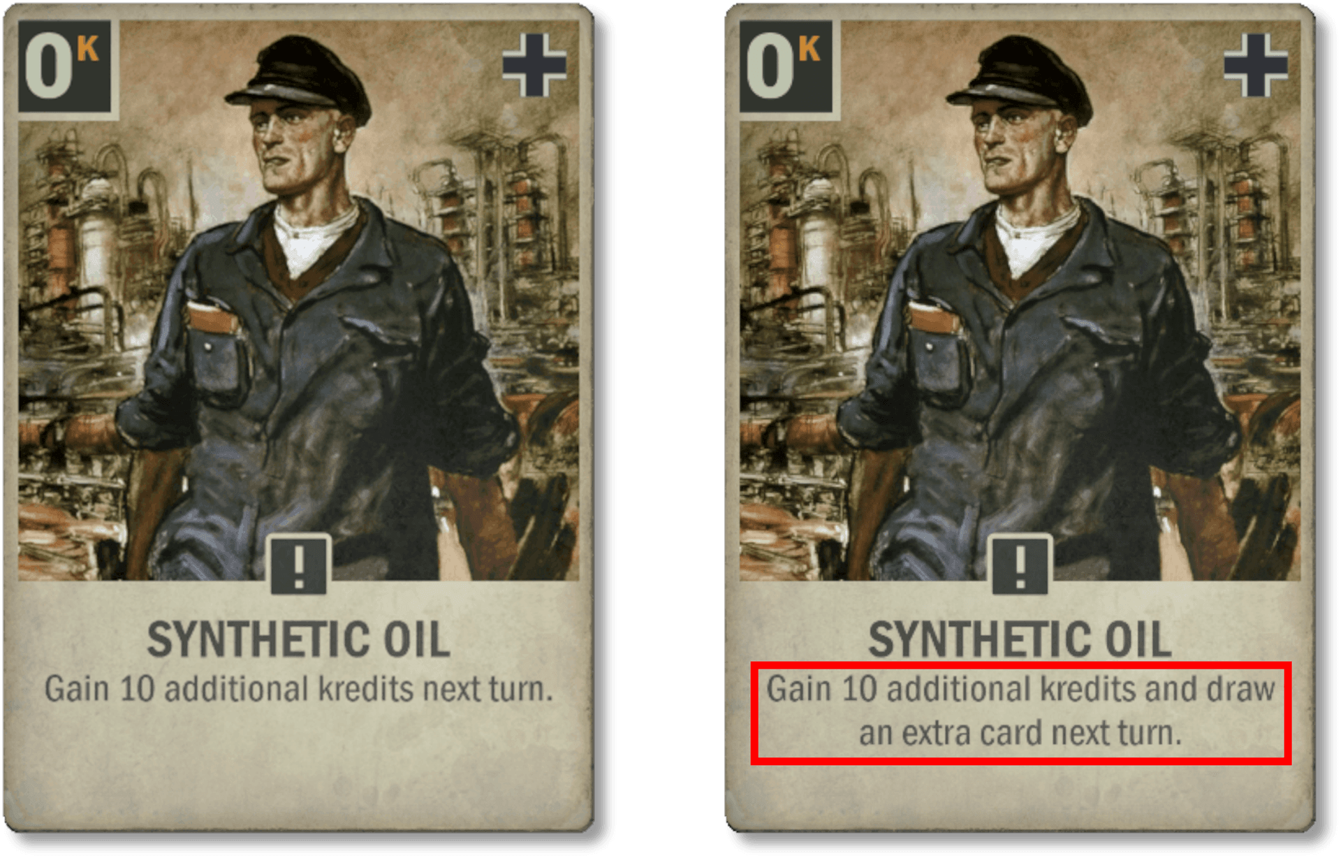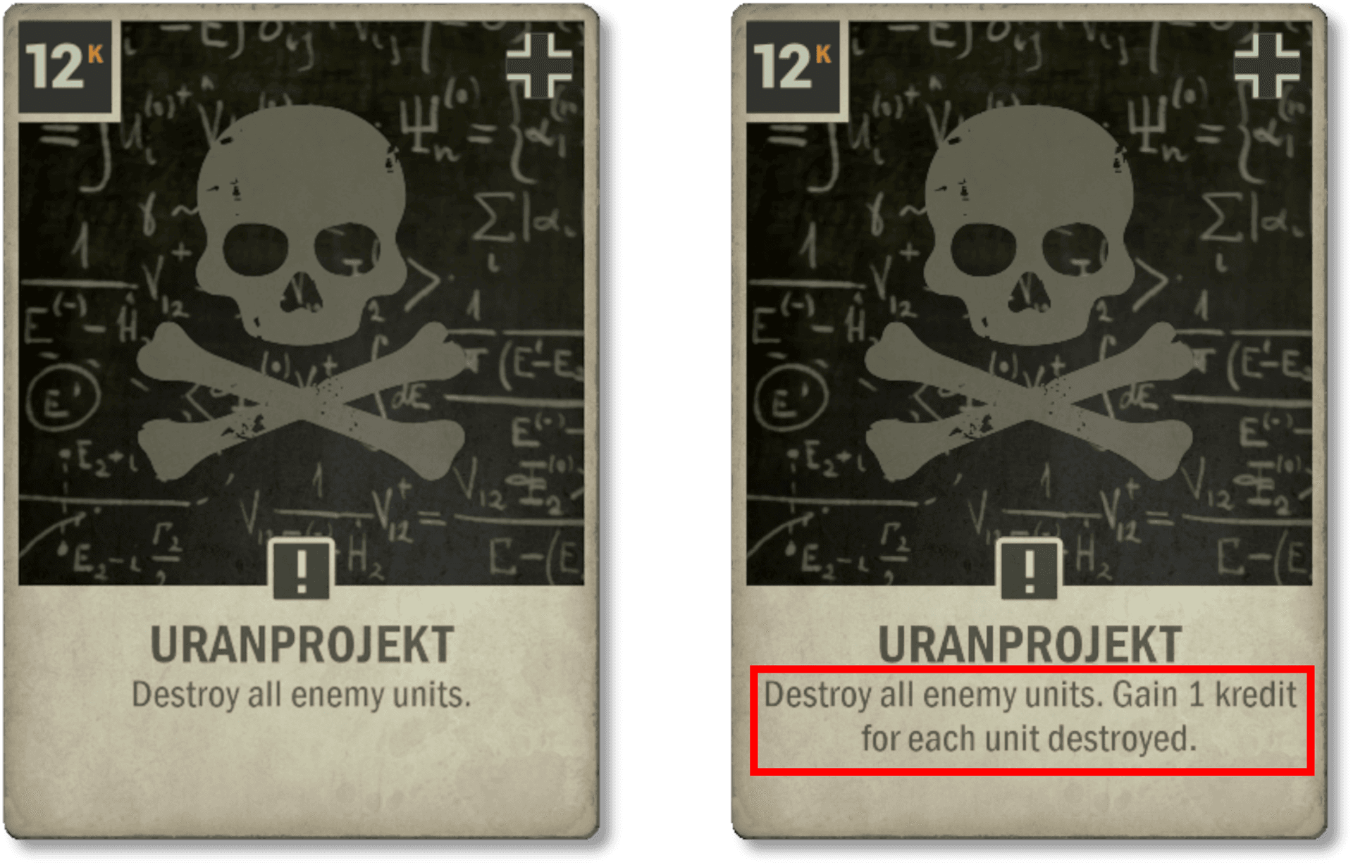 Il est toujours un peu regrettable qu'une carte avec une illustration et une animation aussi cools soit si peu jouée. C'est en partie parce que l'autre option de recherche de haut niveau pour l'Allemagne (U-Boot type XX-I) est très forte, mais surtout parce que dépenser tout votre tour pour ça était généralement un investissement peu intéressant à ce stade de la partie. Désormais, vous gagnez quelques Krédits, ce qui vous donne l'opportunité d'accomplir des actions stratégiques après avoir nettoyer le plateau ennemi.