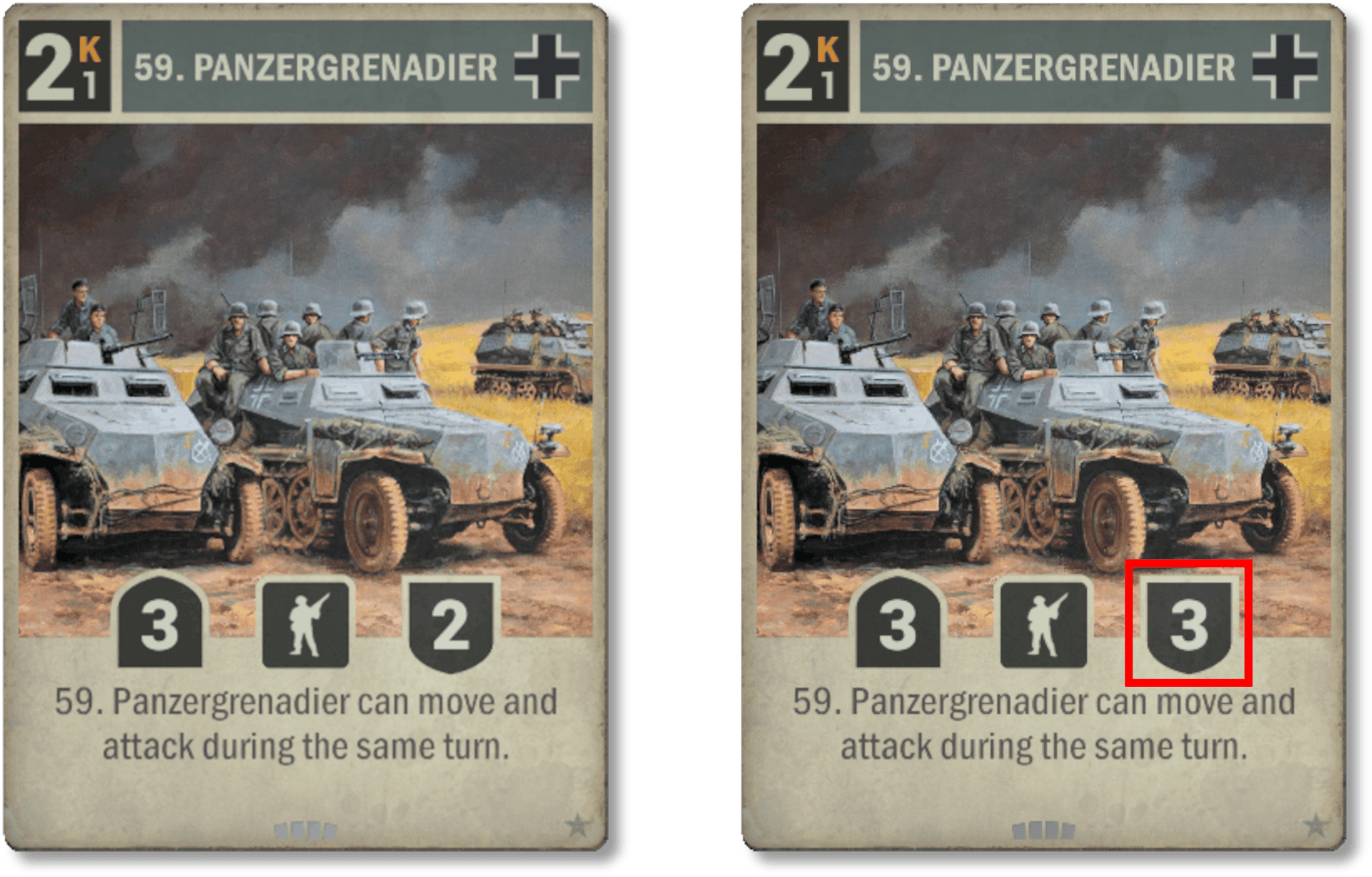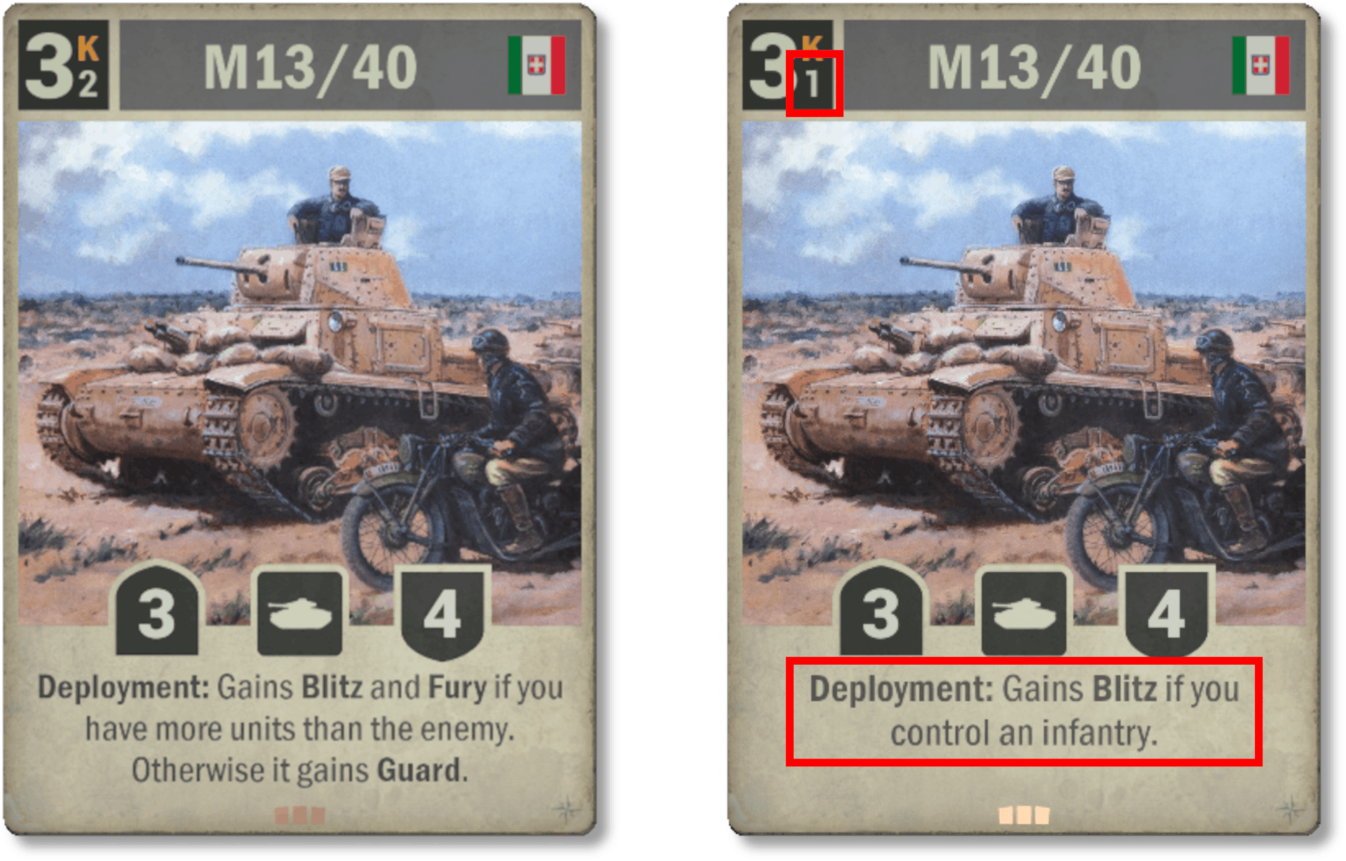 Le M13/40 italien connaît le changement le plus important. Son ancienne version comptait beaucoup de mots mais n'a connu que peu de temps de jeu. Nous espérons qu'il sera joué bien plus souvent sous cette nouvelle forme au texte nettement moins long. D'une certaine façon, il peut être considéré comme le grand frère du Panzer 35(t) et pourrait bien s'intégrer dans les decks Forces Combinées.
