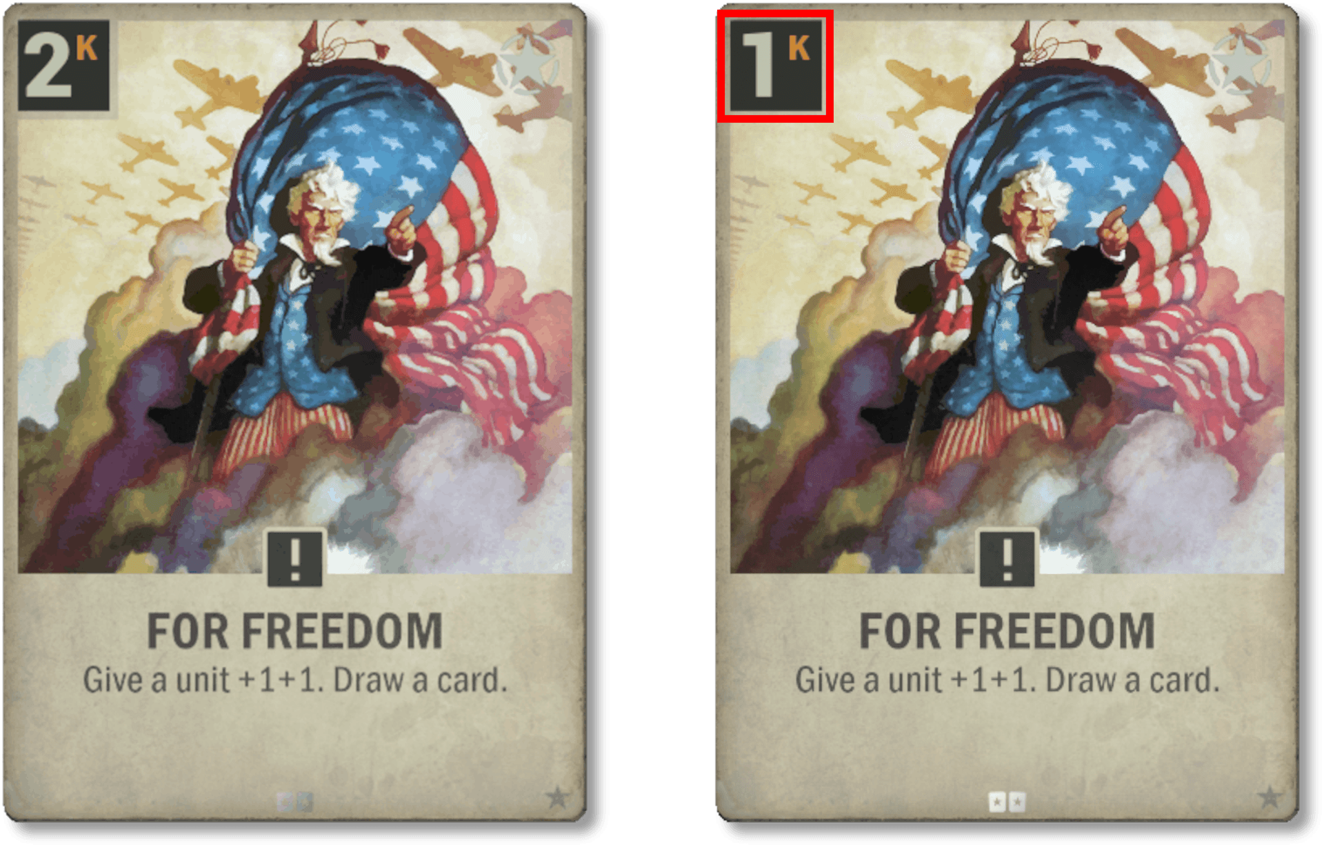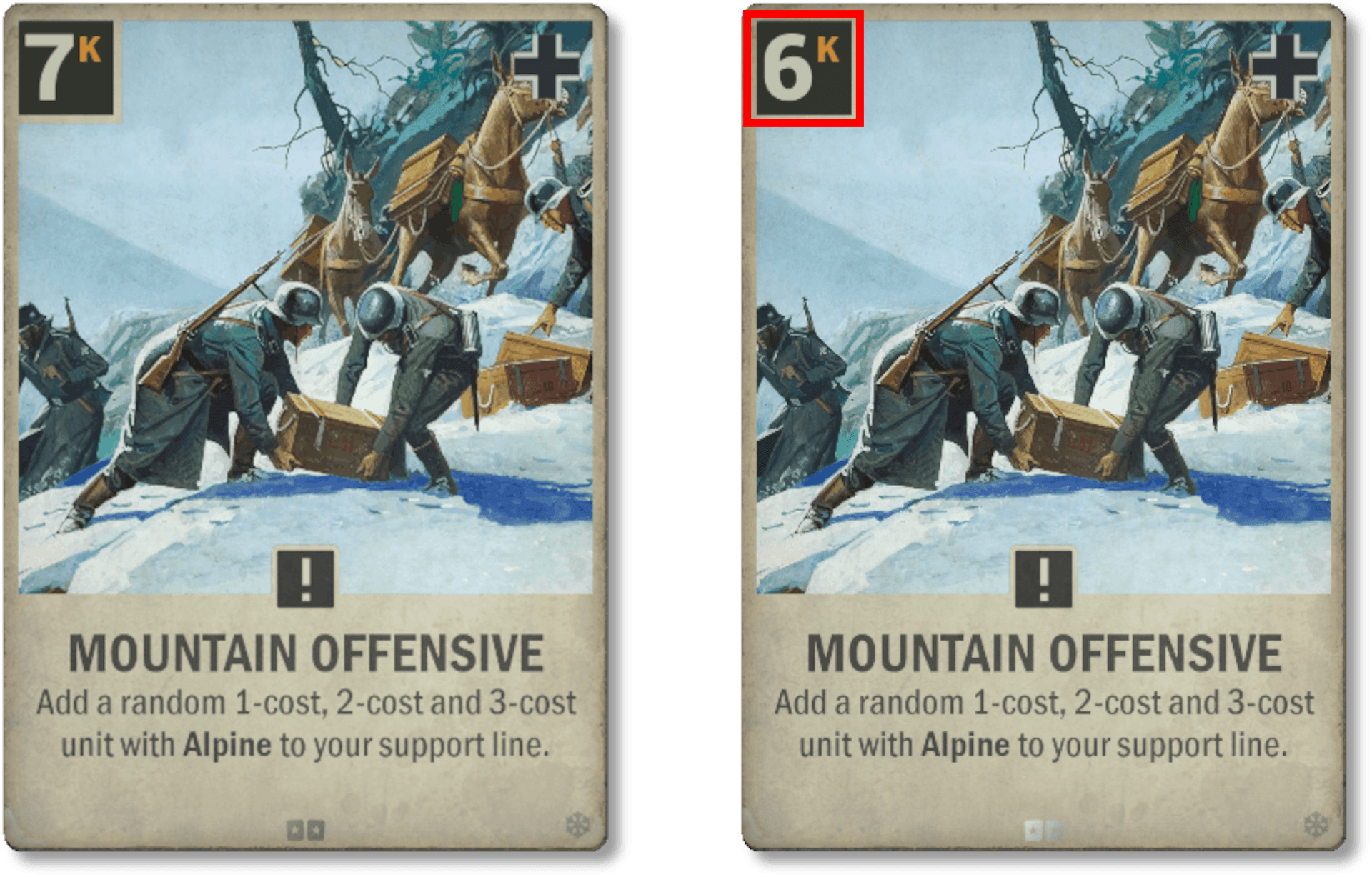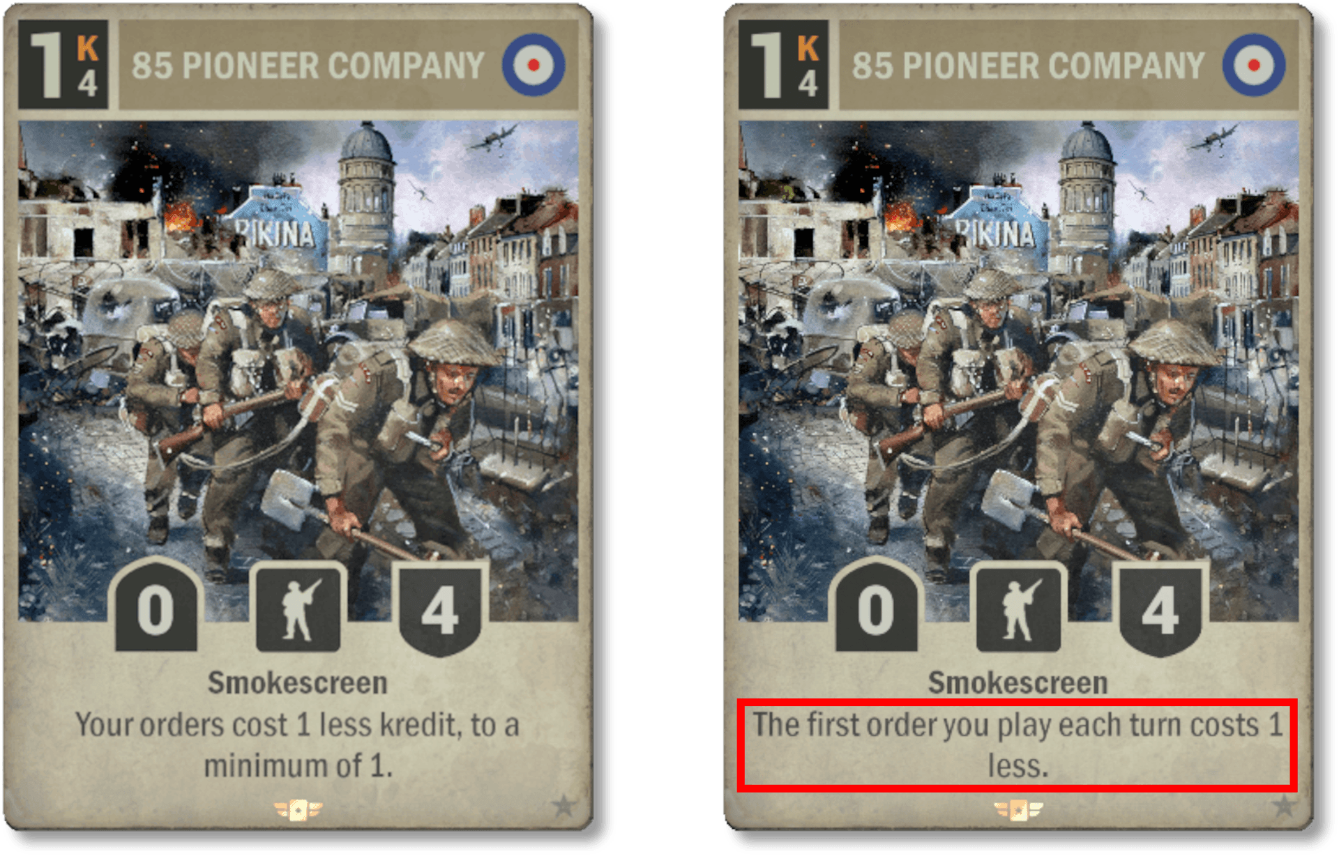 La 85e Compagnie de Pionniers peut générer beaucoup de valeur, en particulier en fin de partie lorsque vous êtes assis sur un tas de Krédits. Cela peut être problématique dans certains decks ; nous voulons donc limiter un peu sa puissance. La nouvelle version implique que les joueurs devront maintenant dégager de la valeur de cette carte progressivement, au cours de plusieurs tours. Notez cependant que la limite de réduction du coût à 1 a disparu ; un ordre coûtant normalement 1 Krédit peut donc maintenant être joué gratuitement si c'est le premier ordre donné pendant le tour. Par exemple, si l'ennemi joue en premier et déploie un 15e Régiment de cavalerie, il est maintenant possible de déployer une 85e Compagnie de Pionniers au premier tour et d'utiliser immédiatement Puissance navale, Debout et unis, À travers la brèche, etc. Elle n'offre plus la possibilité de faire des tours explosifs en fin de partie, ce qui peut être considéré comme un nerf globalement, mais ceci est un peu compensé par un potentiel légèrement renforcé en début de partie.