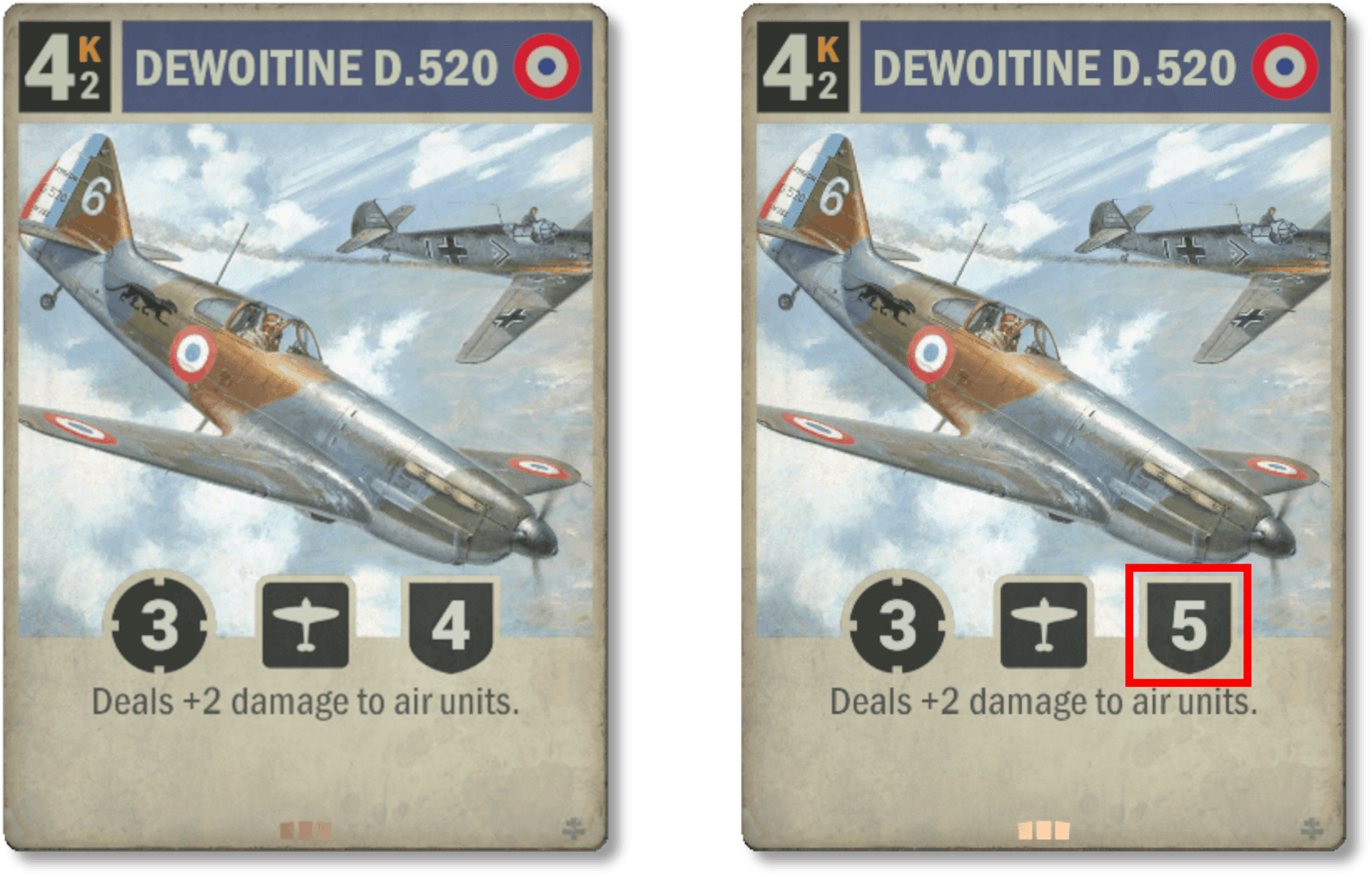 Historiquement, le Dewoitine était en réalité un chasseur efficace qui a réalisé de très bonnes performances. Nous voulons refléter un peu mieux cela en l'améliorant légèrement. Les decks aériens français sont toujours loin d'être viables, mais ils ont désormais une unité correcte de plus pour remplir leur liste.