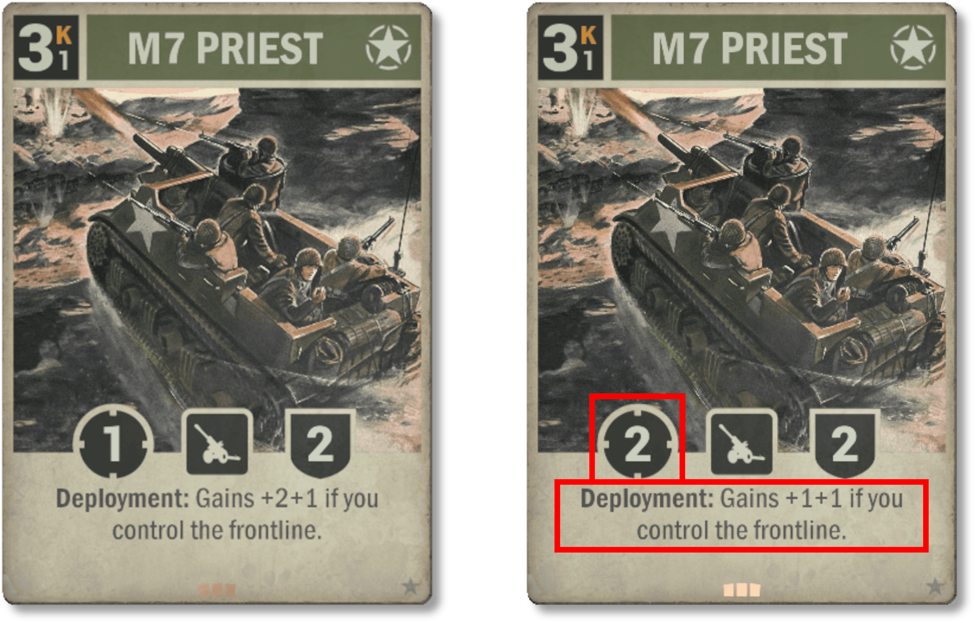 Il en va différemment pour le M7 Priest ; son profil est maintenant beaucoup plus agressif et il possède de bonnes chances d'être joué à plus haut niveau. Nous voulons que cette carte soit au même niveau que le Nebelwerfer allemand et les deux devraient être bien mieux comparables maintenant.
