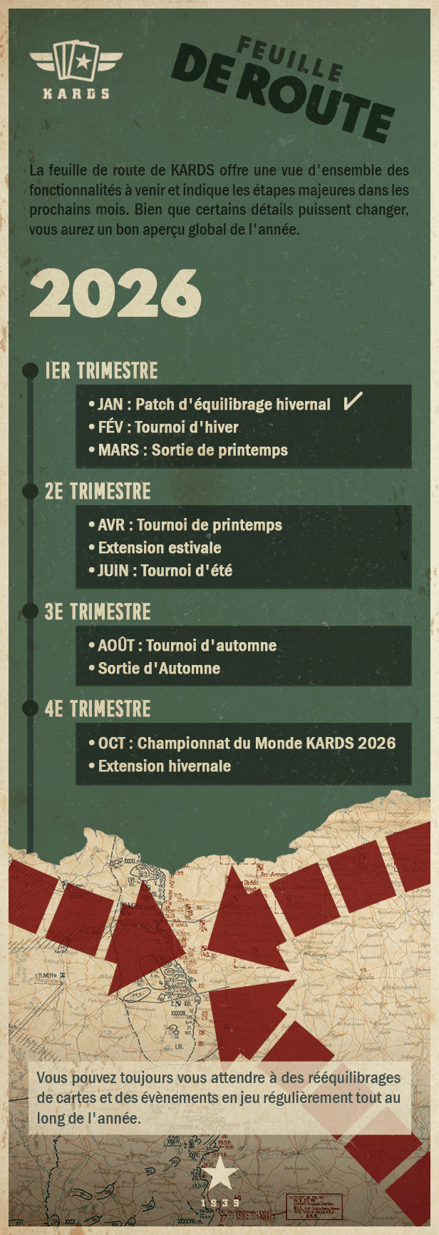 Elle n'indique pas tous les patchs réguliers, les mises à jour mineures, les rééquilibrages ou les évènements en jeu. C'est toujours une partie essentielle de notre travail continu pour améliorer KARDS, mais la feuille de route doit rester lisible et se concentrer sur la campagne dans son ensemble plutôt que sur chaque opération.