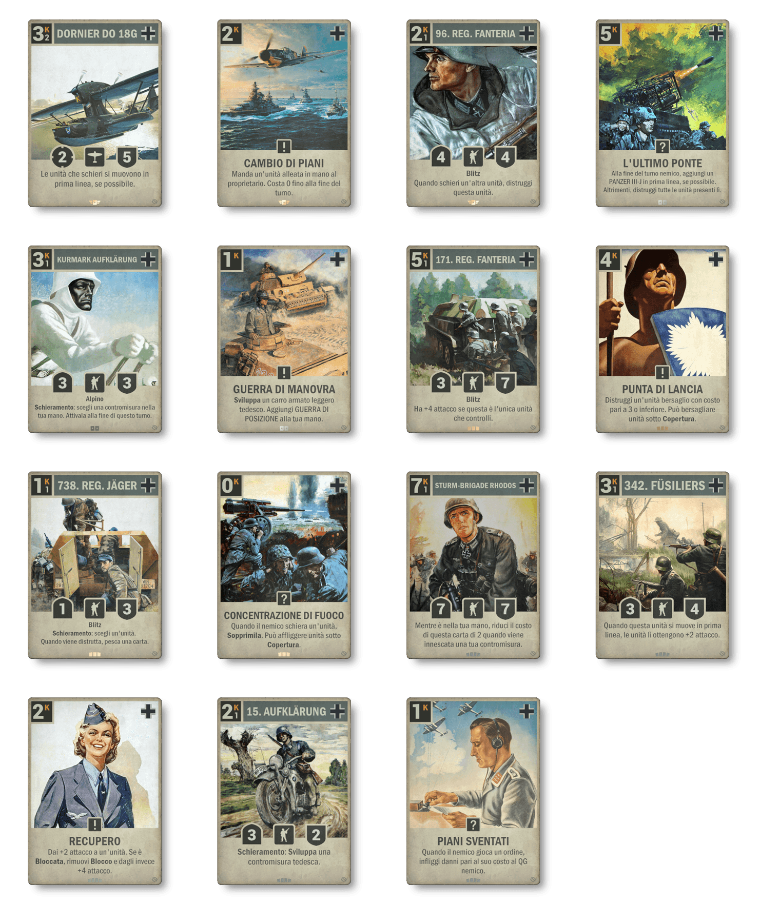 Con Operazioni Segrete, la Germania riceve un solido supporto per le proprie contromisure. Vediamo diverse nuove carte che supportano questo tema, fornendo interessanti nuovi approcci. Inoltre, e in conformità con lo sviluppo storico della Seconda Guerra Mondiale, vediamo nuove carte a supporto per un rapido dispiegamento in prima linea. Il tema tedesco di quest'estate si completa con un po' di supporto anti-copertura e alcuni potenziamenti stand-alone.