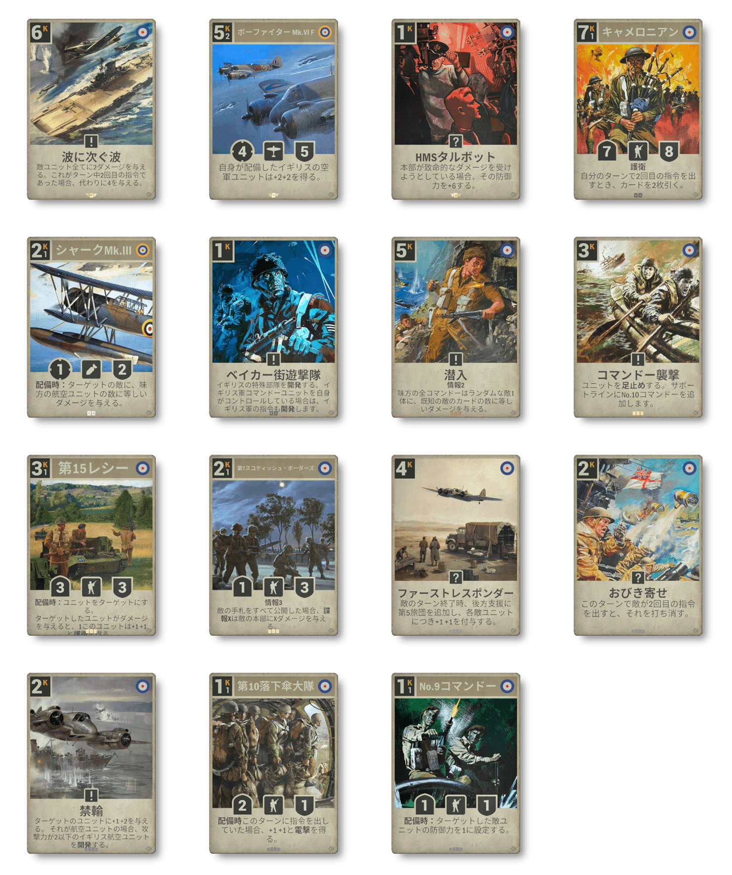 第二次世界大戦中、イギリスはコマンド部隊を開発し、破壊、妨害、潜入に多用しました。 KARDSに新しいコマンドーユニットを導入し、イギリスのコマンドーテーマを目立つスポットライトに引き上げるためのカードを追加することで、これを称えています。 第二次世界大戦中の英国空軍の顕著な役割に従って、英国は空軍の支援を受けます。 さらに、興味深い新しい効果として、特定のアクションが二回行われたとき(例えば、ターン中に指令を二回出したとき)をサポートする。