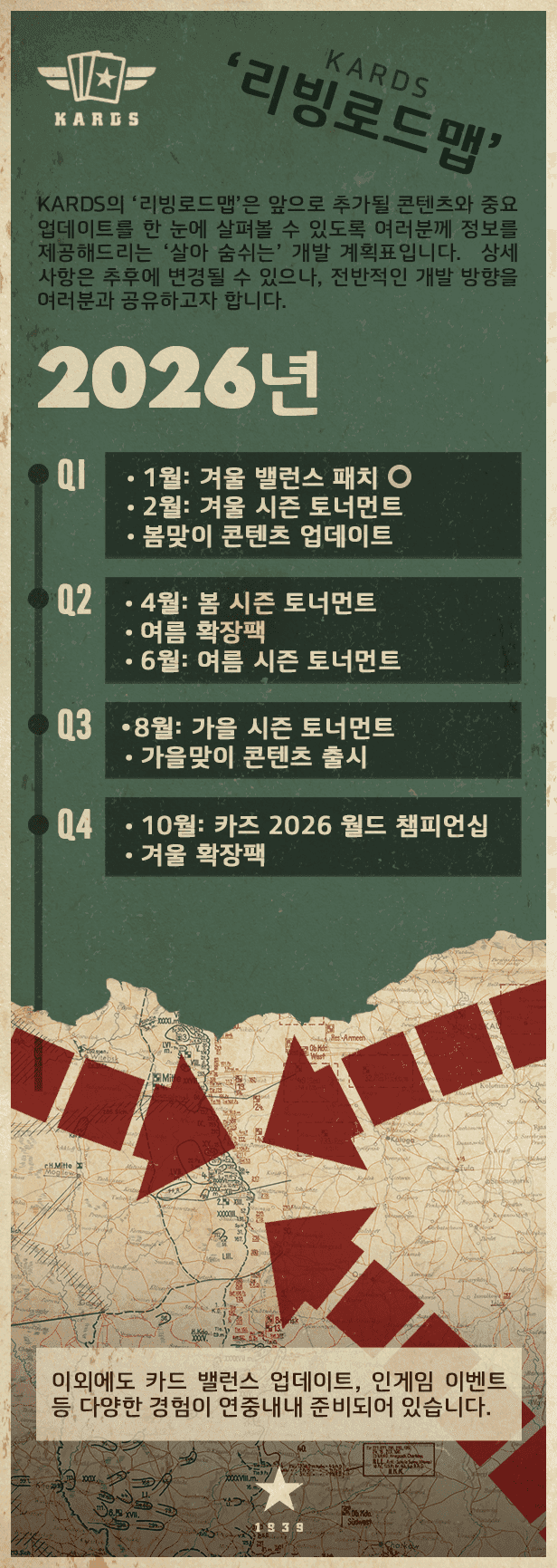 카즈 로드맵은 ‘카즈: 제2차 세계대전 카드 게임’의 주요 일정을 정리해 보여주는 전반적인 안내 자료로, 정기적으로 업데이트됩니다. 확장팩, 시즌별 콘텐츠, 각종 토너먼트와 연간 월드 챔피언십 같은 대표 이벤트 등 한 해를 이루는 핵심 요소들로 구성되어 있습니다.