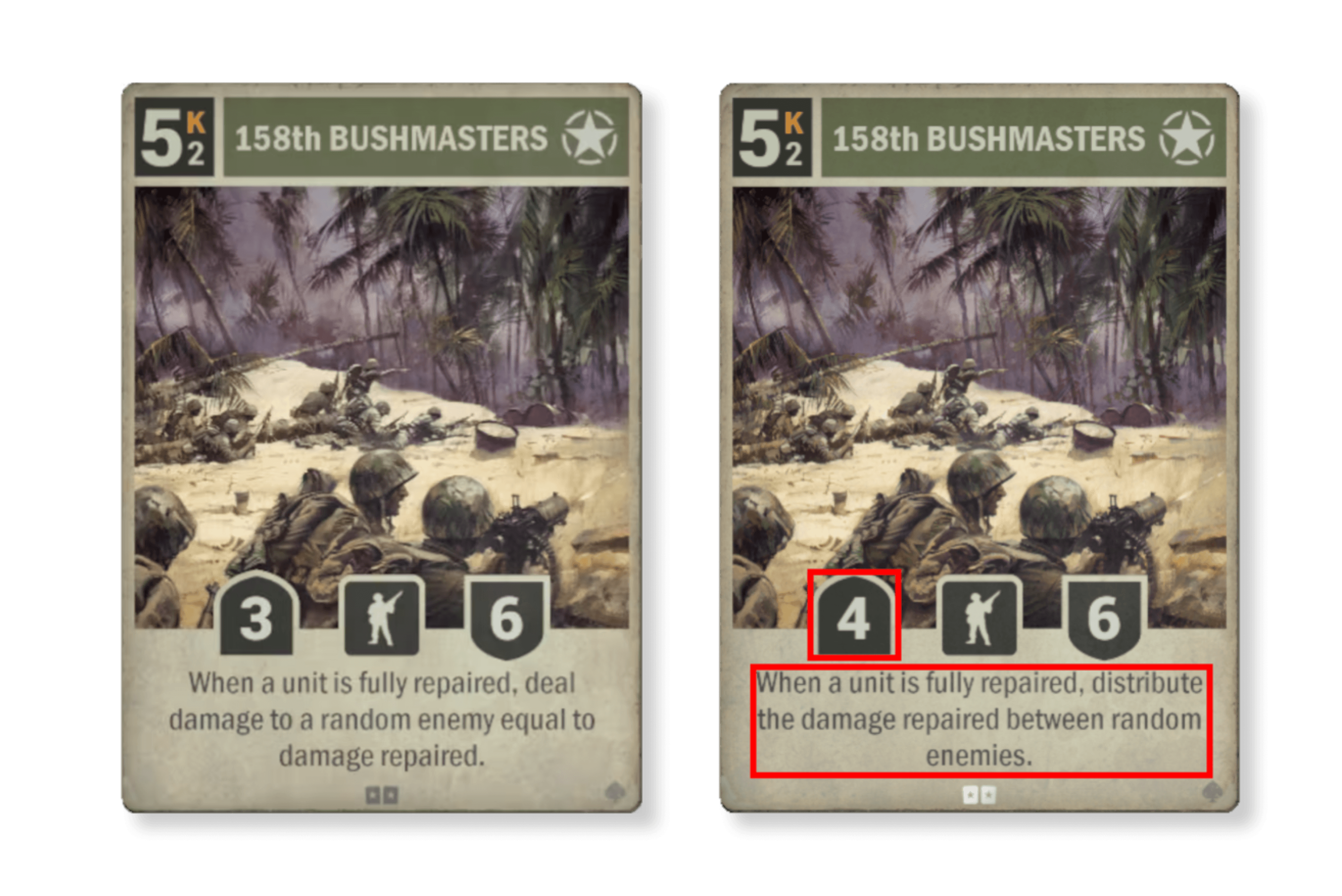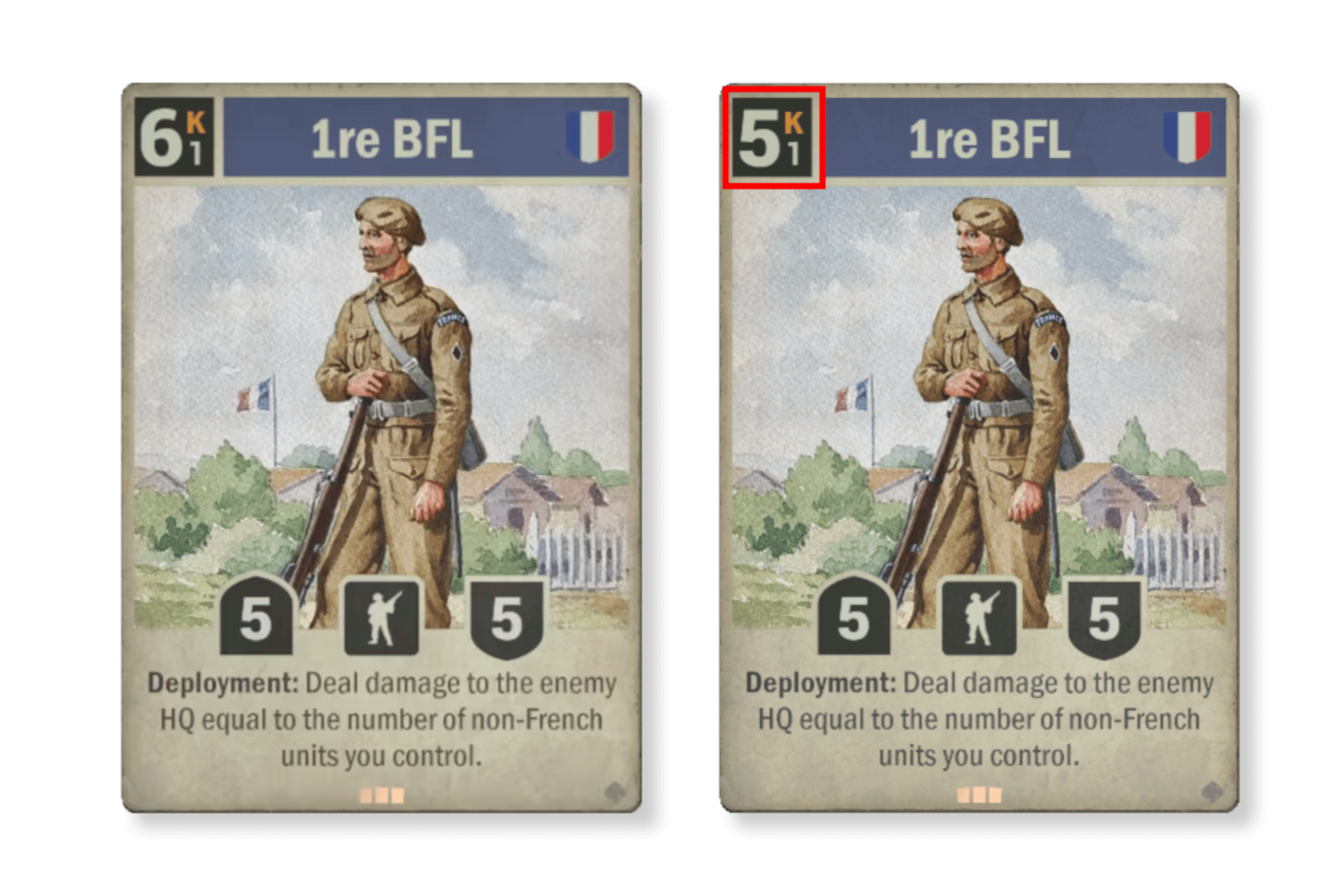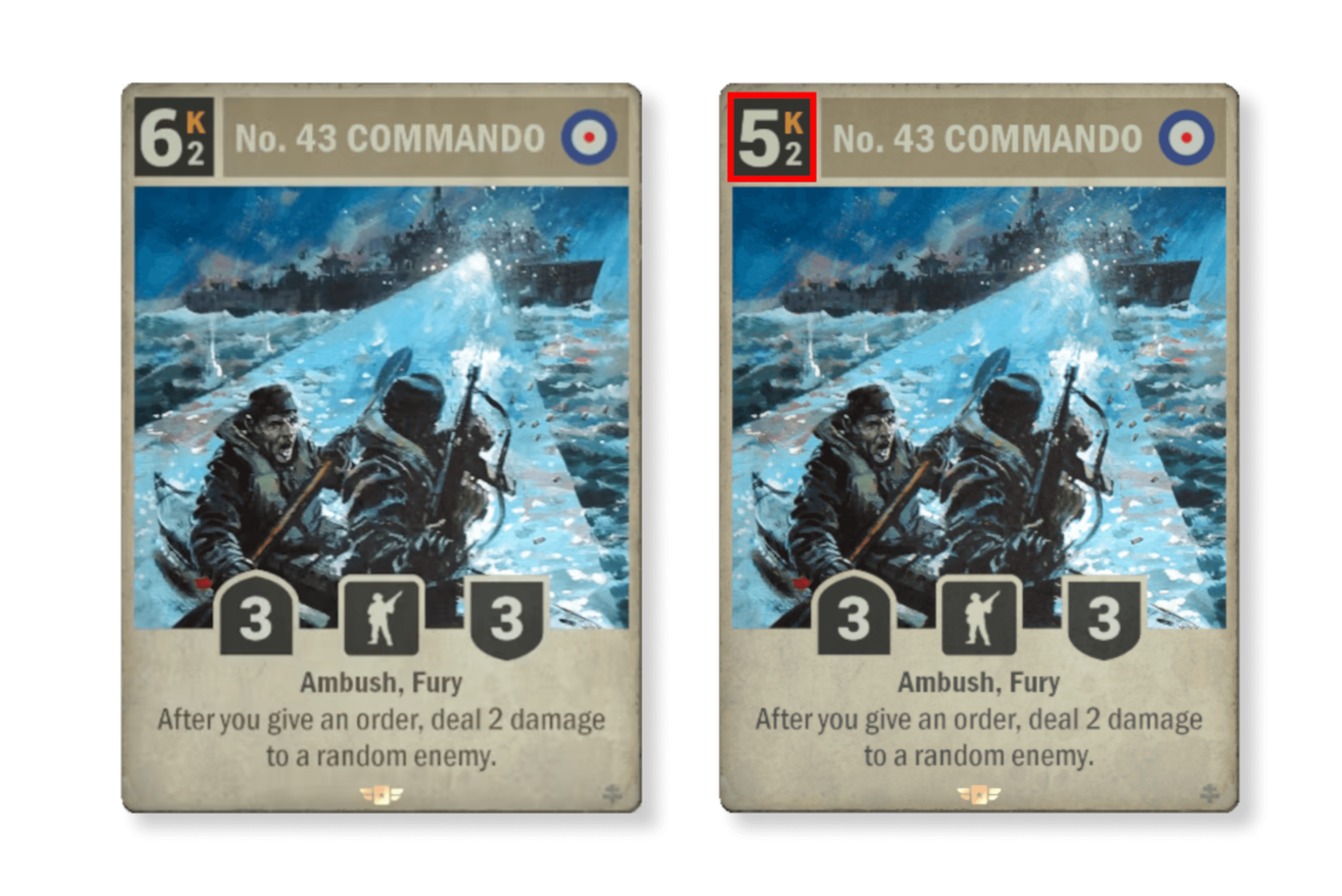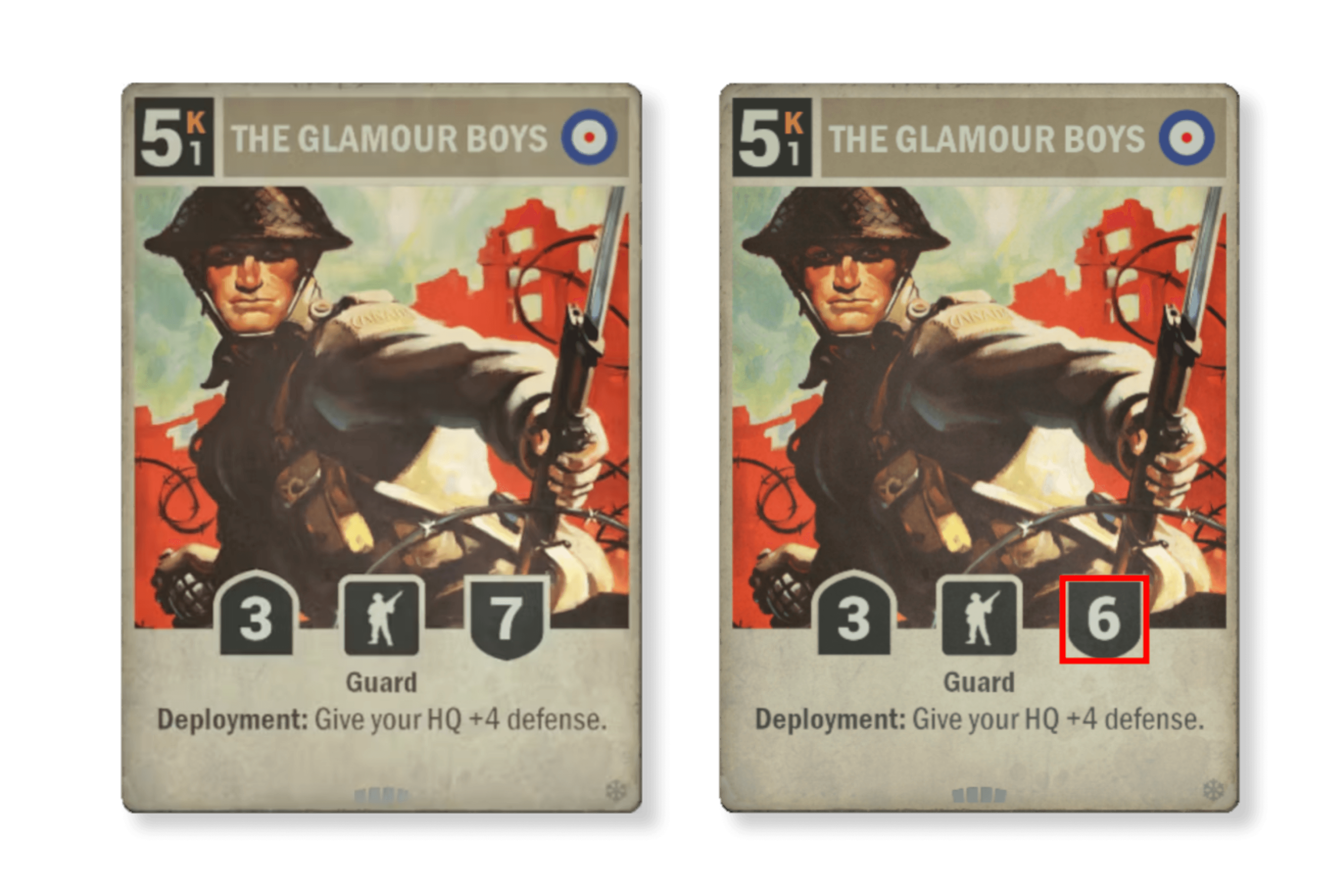 다음은 위에서 언급한 두 번째 그룹의 카드의 첫 번째 예입니다. 게임에서 가능하면 보고 싶지 않은 효과(카드 디나이얼)를 가진 카드입니다. 그래도 상징적인 이름이고 전쟁의 대표적인 이미지이기 때문에, 언젠가는 재작업 되어 돌아올 카드이기는 했습니다. 저희는 독일의 유보트 카드와 일맥상통하는 버리기 플레이와의 연관성을 유지하기를 원했습니다. 효과 면에서는 이것은 대공 대응책과 유사합니다. 차이점은 어떤 유닛에 그 효과를 적용시킬지를 더 잘 제어할 수 있다는 것입니다. 이것은 강력한 카드이며, 다시 조리 메뉴에 올라오면 대부분의 플레이어가 상당한 시간을 이 카드와 함께 할 것으로 기대됩니다.