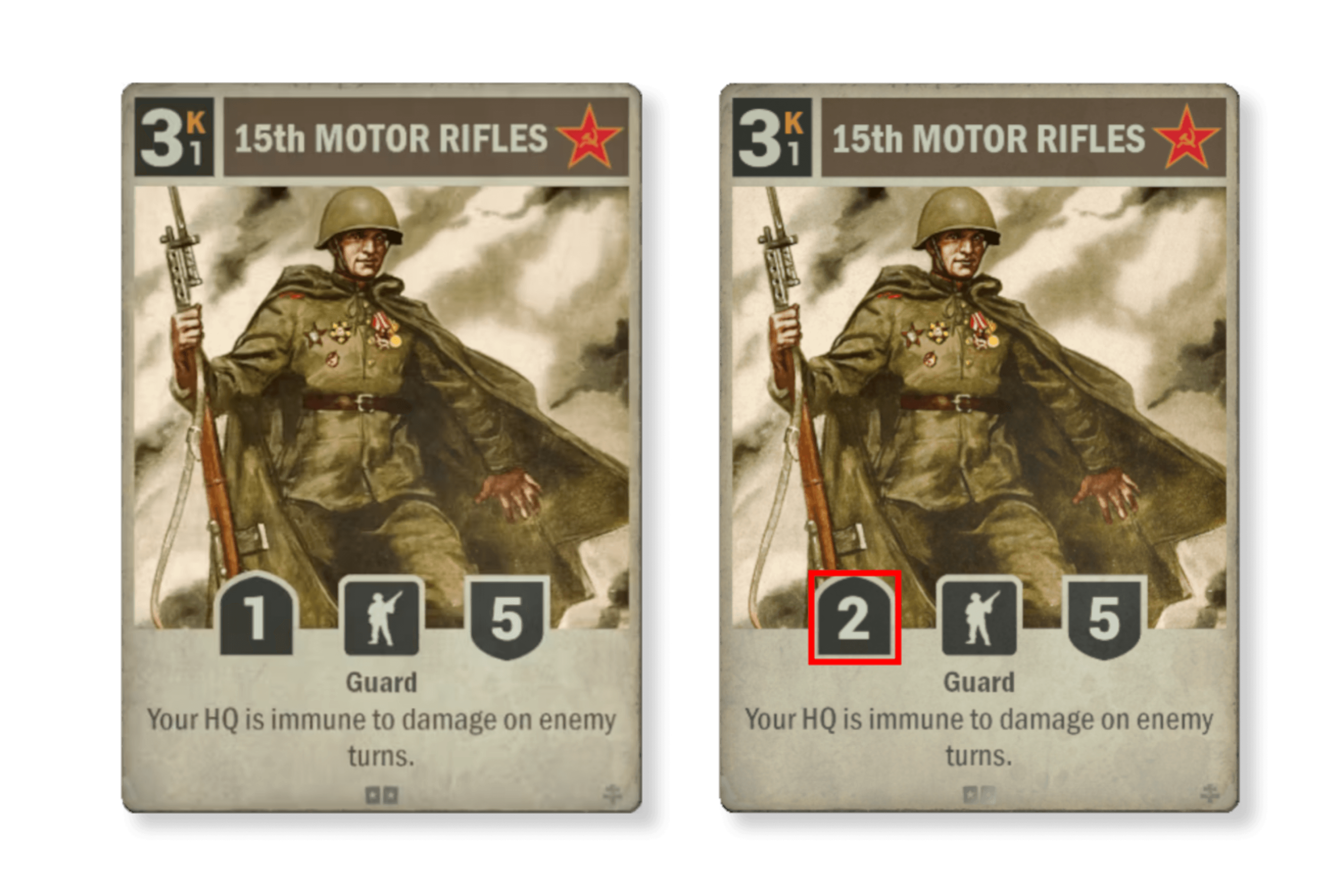 본부 피해 면역은 사소한 것이 아니지만, '15 차량화 소총부대'의 허약한 체질은 그들이 두 발로 스스로 서는 것을 허용치 않았습니다. 이제 공격력 2의 상승과 함께, 이 오래된 전쟁의 노병에게 짖는 것 외에도 물어 뜯을 힘이 있는지, 그리고 소련 컨트롤 덱이 필요로 하는 지원을 제공할 수 있는지 지켜보겠습니다.