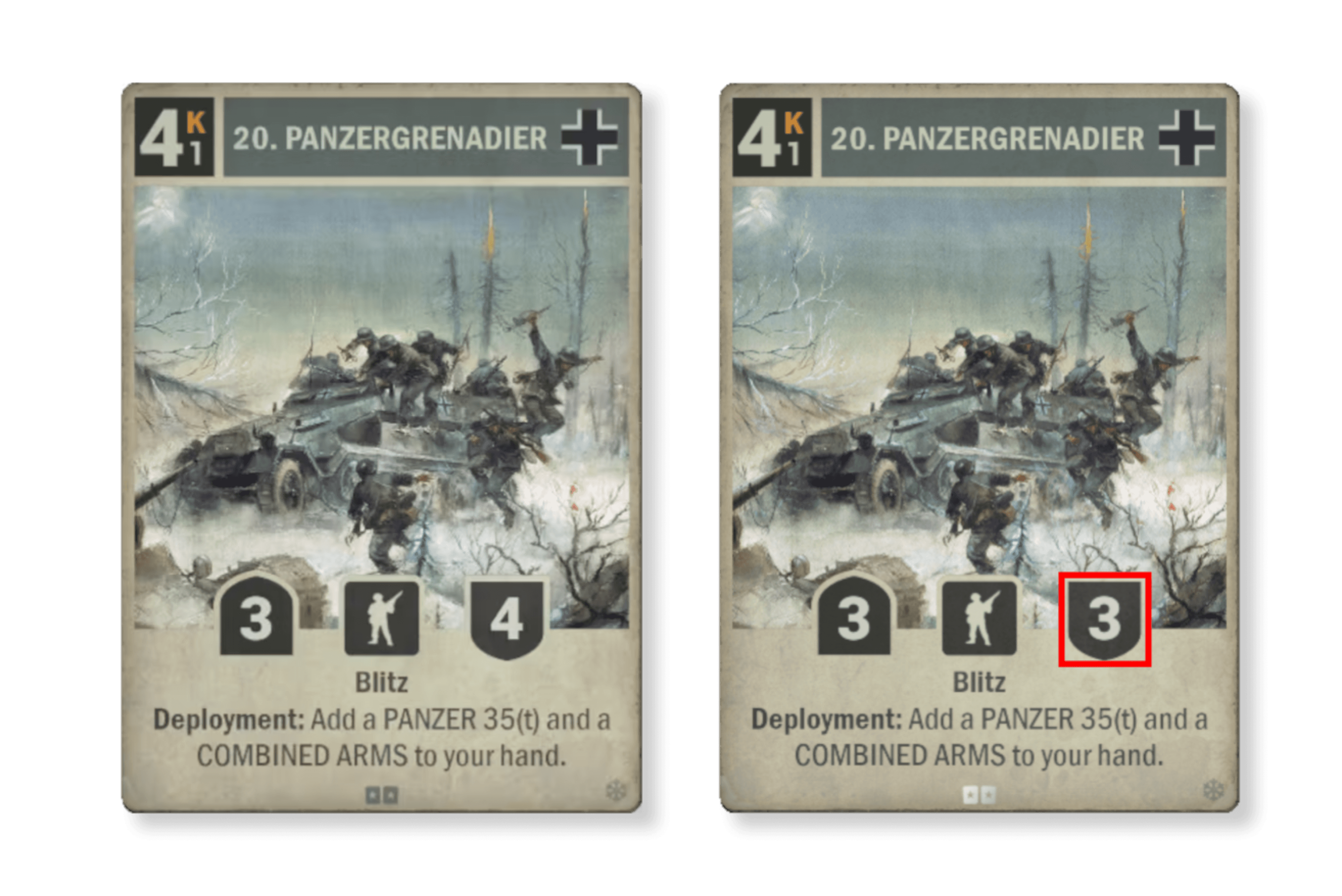 이 일명 '통조림 군대'는 바쁜 세상에서 바쁘게 사는 사람을 위한 이상적인 카드입니다. 급할 때 먹기 좋은 캔 스프 같지요. 하지만 흔히 그렇듯, 쉐프가 너무 많으면 육수가 간이 맞지 않게됩니다. 그리고 현재 '제20 기갑척탄병연대'로 간을 맞추는 쉐프가 너무 많은 것 같습니다. 때문에, 저희는 통조림 캔에서 '방어'를 살짝 빼 보려고 합니다. 이 조정이 화룡점정과 같은 셰프의 키스로 마무리 지어질지 두고 보겠습니다.