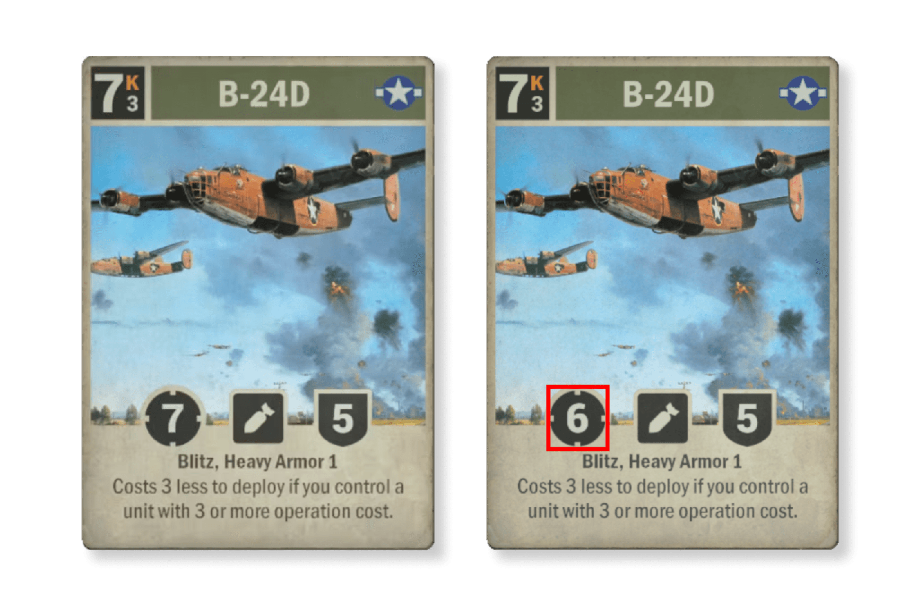 이 은근히 눈에 띄지 않는 카드, '생산 주문'이 제공하는 가치는 너무 컸습니다. 기존의 'B-24 리버레이터' 기본형과 비교했을 때 이 두 종의 파생형은 이익밖에 가져다주지 않는 그런 유닛이었고 '사기 카드'로서 너무 많은 활약을 했습니다. 면도날로 공격력 1을 덜어냄으로써, 이 카드들은 여전히 가치가 좋은 카드로 활약할 테지만, 성층권에서는 설치는 모습은 아마 보기 힘들 것입니다.