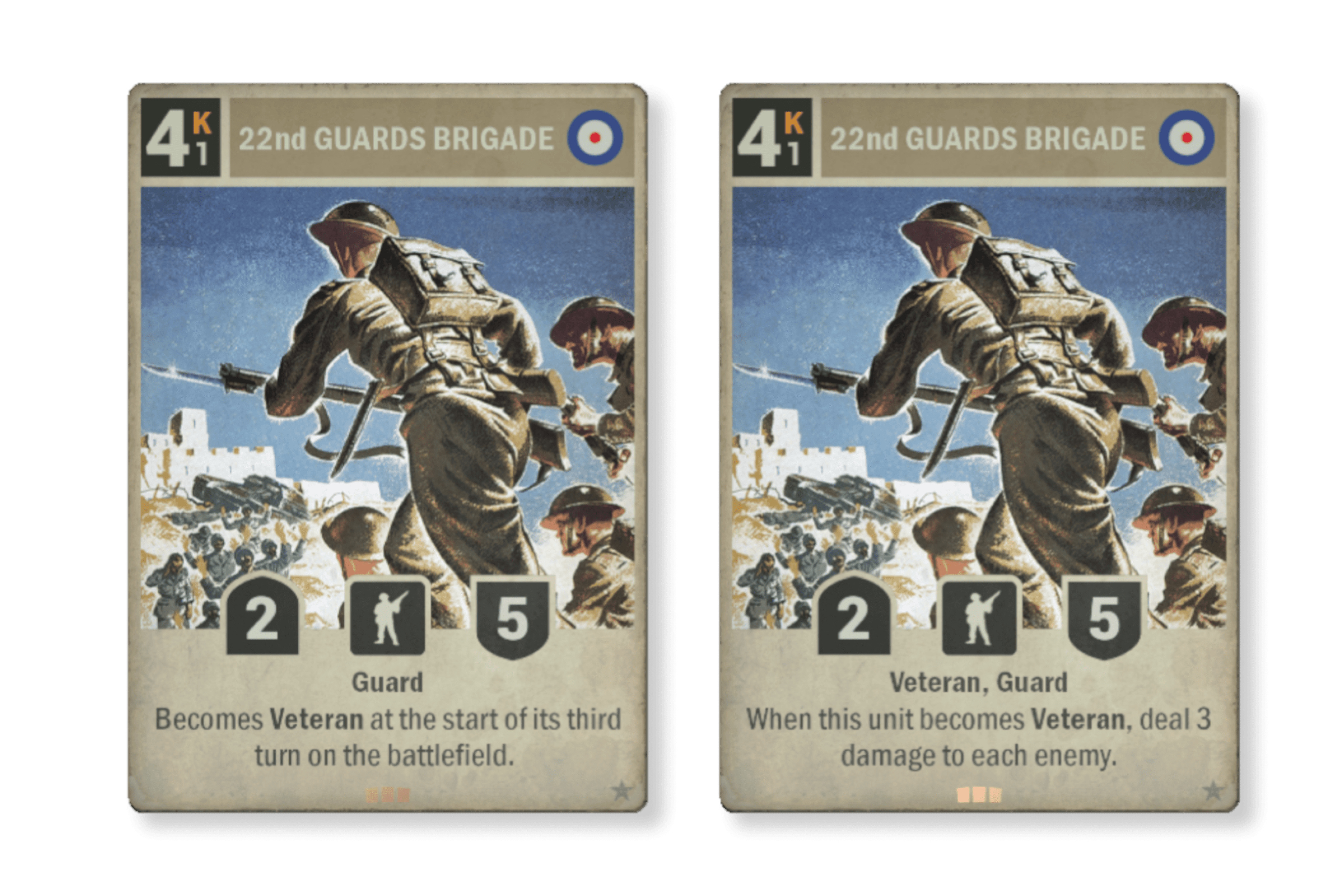 '제22근위여단'은 모든 적에게 융단 폭격 수준의 피해를 입히는 혁신적이고 새로운 공격 체제를 제공합니다. 전장에서 느긋하게 쉬고 있으면 하면 적이 우수수 파리처럼 떨어지기 시작할 것입니다. 세상에서 가장 재미있는 우스갯소리처럼 들릴지 모르지만, 진짜 그렇게 될 수도 있습니다. '제22근위여단'을 베테랑으로 승급시키는 방법은 여러가지가 있으며 지금까지 있었던 승급 효과에서 최고의 보상 중 하나가 될 것입니다. 주목해야 할 것은 유닛 뿐만 아니라 모든 적 대상에게 피해를 입힌다는 사실입니다.
