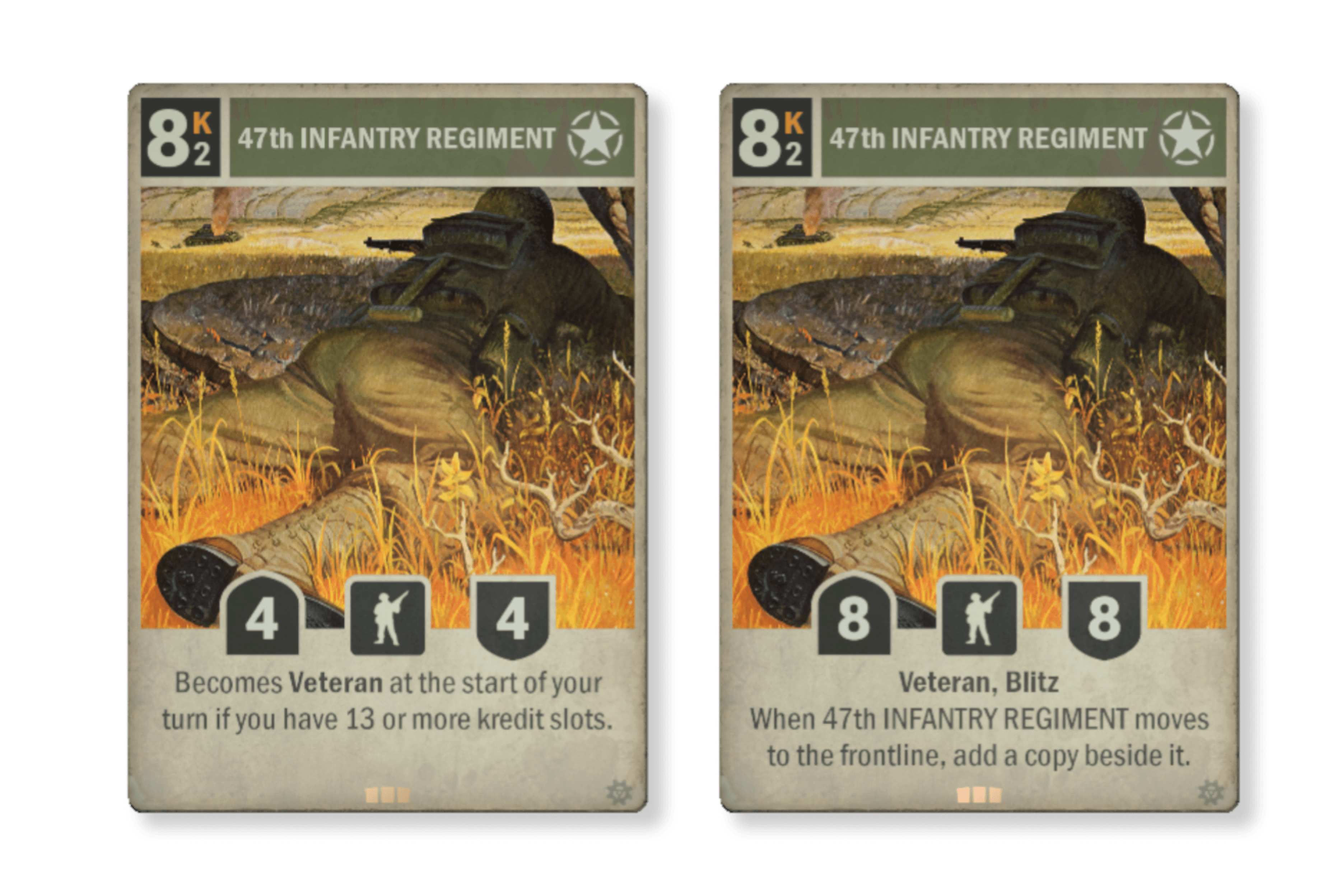 기본 카드는 이전 버전과 유사하지만 램프 관련 기능이 변경되었습니다. 베테랑으로 승급 시 부여되는 기습은 복사본이 적의 후방을 곧바로 공격할 수 있음을 의미합니다. 약간의 준비가 필요하지만 당하면 꽤 약 오르는 전략이 될 것입니다. 결론은 '제47보병연대'는 이제 허접한 바보 유닛이 아니며, 대신 후방의 빠른 공격을 목표로 하는 램프 전략의 핵심카드가 될 수도 있습니다. 중요한 것은 이전처럼 조롱받는 호구 카드가 더 이상 아니라는 것입니다.