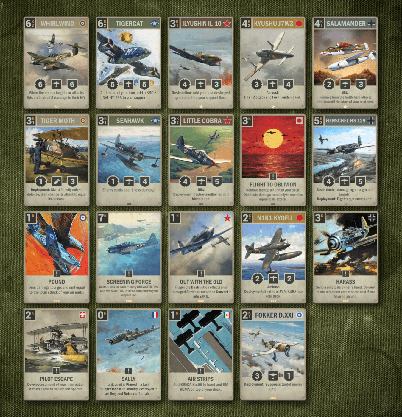 The Air Supremacy mini-set introduces 19 new cards, with three additions for each of the main nations and one for each of the ally nations. This set emphasizes air power, with new units and orders that showcase the versatility, disruption, and dominance of aerial combat.