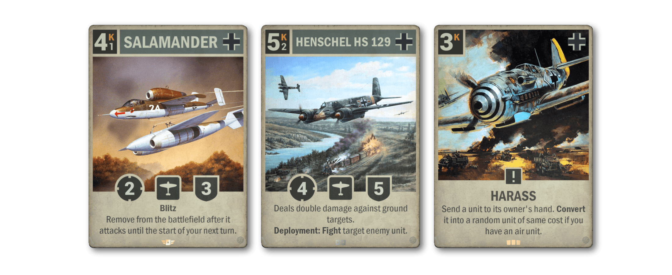 HENSCHEL HS 129 (Special) - A heavy hitter specialized in destroying ground units, dealing double damage to ground targets including enemy HQs, and bringing the heat the moment it enters the battlefield.