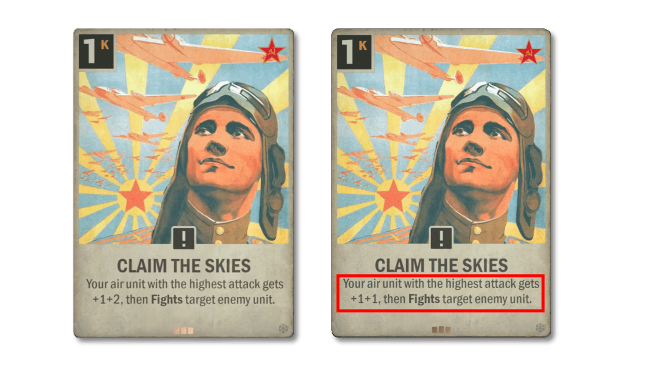 Claim the Skies can claim to single-handedly make Soviet-Italy control viable, alongside its best buddy Fiat G.50. Many aggressive decks have fallen victim to a turn 2 Fiat followed by a turn 3 Claim. This is still possible, but 1 less defense makes the affected air unit slightly easier to deal with. The Skies can still be Claimed, and will, but the current version is pushed a bit too high.