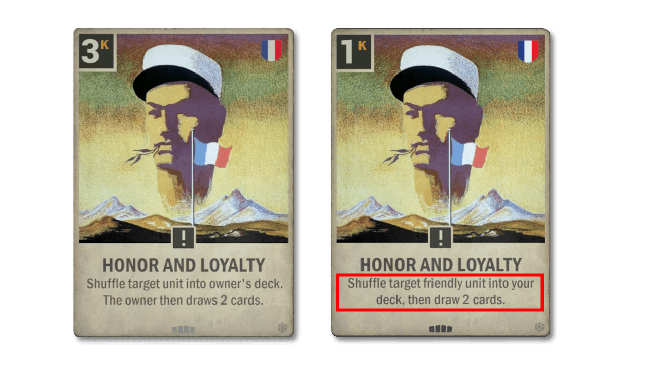 All the honorable gentlemen happily providing their opponents with extra cards are now forced to provide said pleasure only to themselves. But as the saying goes - you cannot love others until you have learnt to love yourself. The shuffle strategy is something France is exploring in Naval Warfare, so it is fitting to adjust this card to lean into that more heavily.