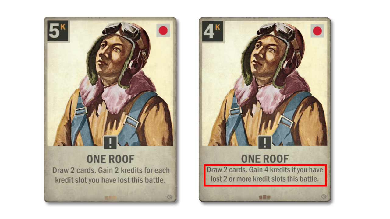 New: 4k, Draw 2 cards. Gain 4 kredits if you have lost 2 or more kredit slots this battle.