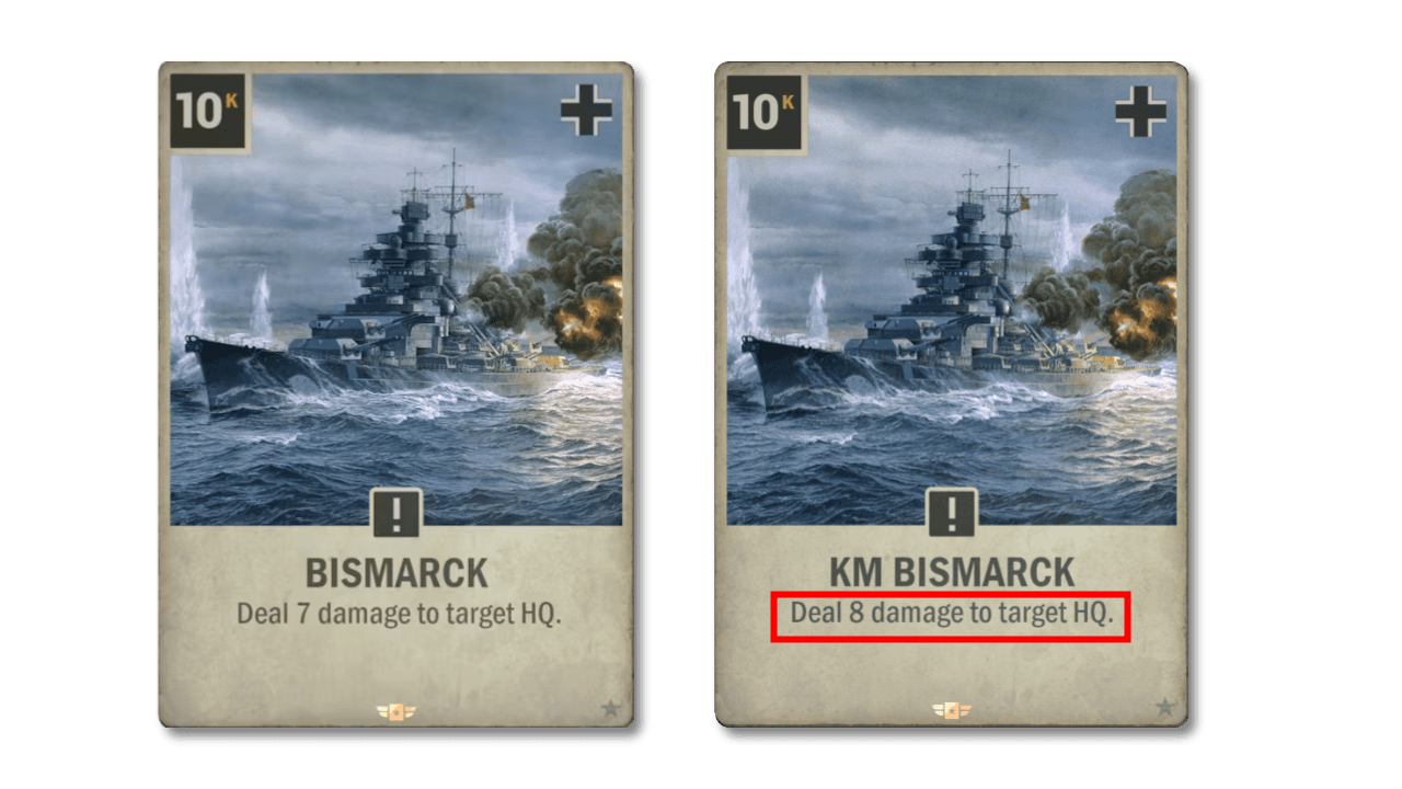 The crew of KM Bismarck has been hard at work making it all shiny and spiffy to celebrate becoming a Navy card, commemorated with a new KM prefix to help identify it. With all the gunk removed, the ship is now performing at optimal level, regaining the 1 damage it lost in an evil balance patch a long time ago.