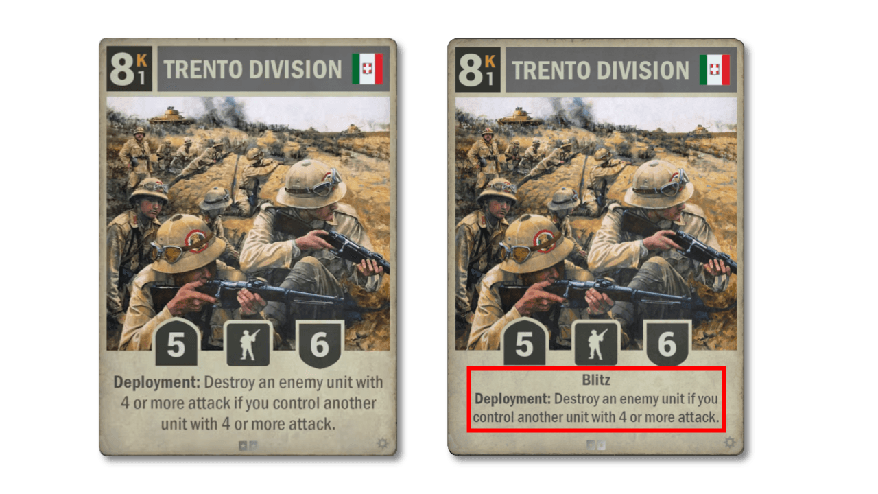 Trento was burdened with an overly restrictive deployment ability. The new ability has been simplified a bit - now you can target any enemy unit, but you still need another 4+ attack unit. Trento is so excited to finally get a chance to get into decks that it broke out in a rash of Blitz in its hurry to become relevant.