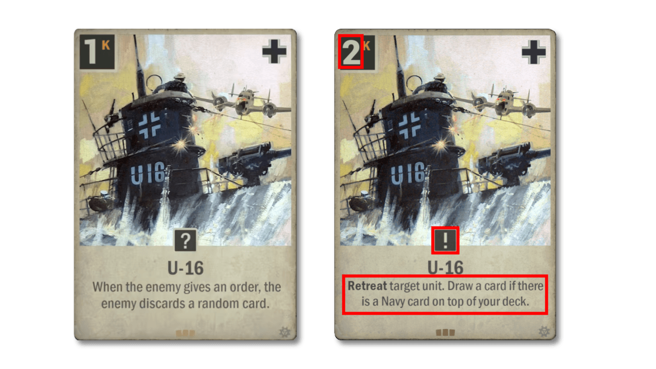 Ah yes, sweet, sweet U-16, how we have missed you in all your glory. Sure, you are now an order, not a countermeasure, and your cost is now 2 instead of 1. And you have a new ability. Totally different ability. Related to the new Navy stuff. And you are now a Navy card yourself. But nevermind that, in our mind you are always the same pure, sweet U-16.