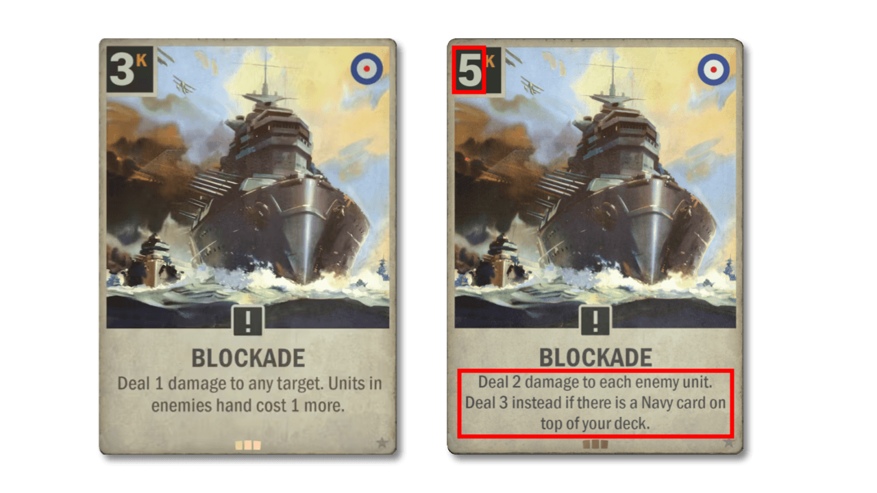 New: 5k, Deal 2 damage to each enemy unit. Deal 3 instead if there is a Navy card on top of your deck.