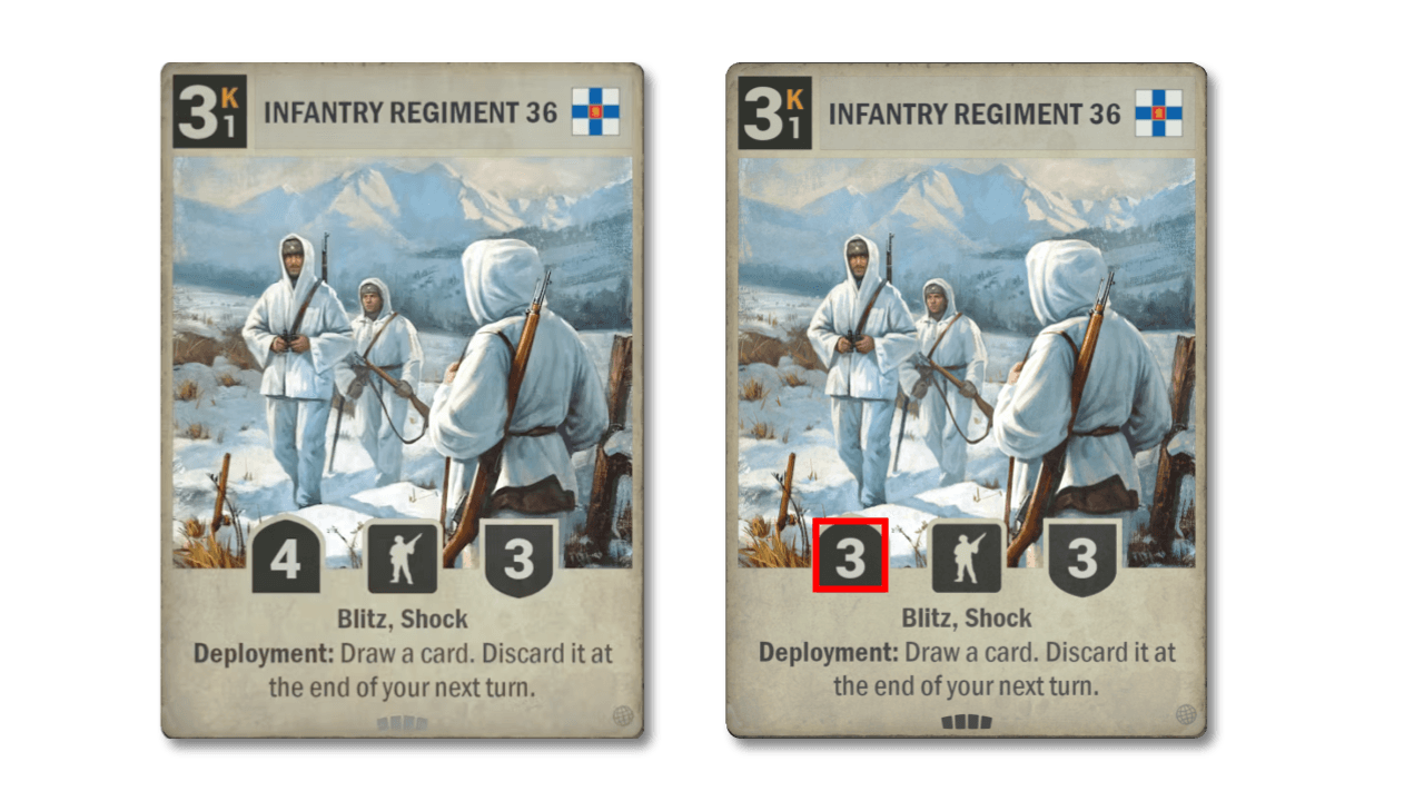 To the shock of no-one, this heavily pushed Finnish card sees a lot of play. It offers great value and highlights the strength of Shock paired with Blitz. So much so that it can promote non-interactivity on the battlefield, which is not something we like to see. So we are tuning this bad boy down a bit, by taking away one of its big guns (if you squint real hard it has been erased from the art).
