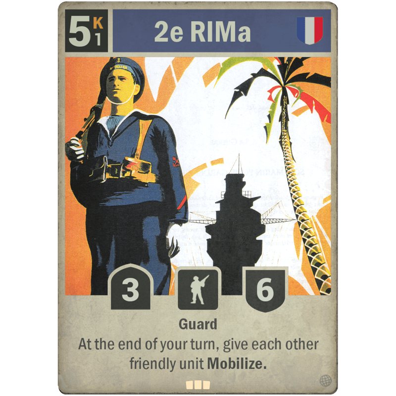 The 2nd Marine Infantry Regiment (French: 2e Régiment d'Infanterie de Marine or 2e RIMa) is a regiment of the Troupes de marine in the French Army which has been active from 1831 to the present day. During WWII, the regiment took part in the Battle of France and resisted the German invasion forces at Amiens, but was dissolved following the fall of France in 1940. The 2e RIMa was restored with the Free French Forces in 1941 and participated in the Battle of Keren during the East African Campaign, as part of the Free French Brigade of the Orient. In 1942 the regiment joined the 2nd Free French Brigade, which in 1943 became part of the 1st Free French Division (1re Division Française Libre or 1re DFL). They were involved in operations and campaigns in Libya and Tunisia, including the Battle of El Alamein and the Battle of Takrouna. The 1re DFL joined the Italian Campaign in April 1944 where it fought in the Battle of Pontecorvo, and landed in Provence during Operation Dragoon, which was the Allied landing in Southern France. Finally in 1945, as part of the French First Army, the division fought German forces in the Colmar Pocket and participated in the city’s liberation.