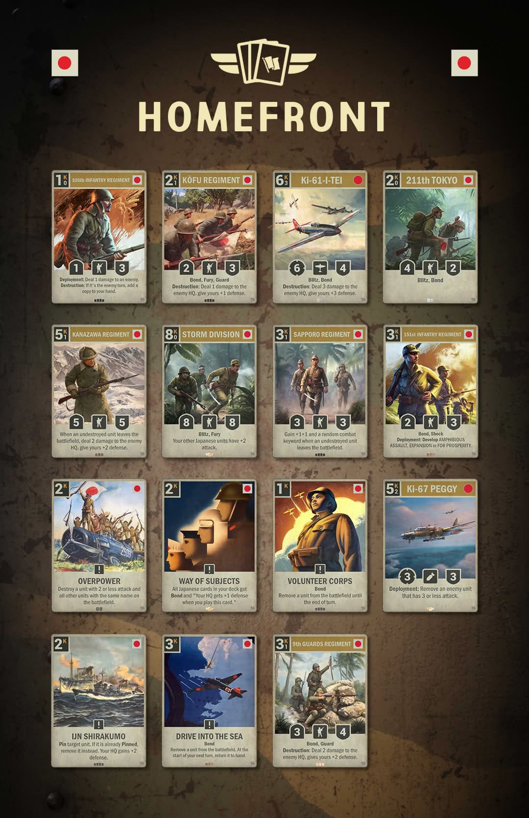 The Ki-61-I-TEI and 211th TOKYO deliver lethal Bond-driven assaults, while the 9th GUARDS REGIMENT and KOFU REGIMENT blend Fury, Guard, and HQ-damaging Destruction effects.