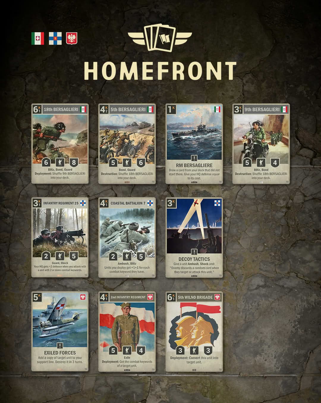Cards like 5th WILNO BRIGADE and EXILED FORCES lean into Poland’s signature ability to copy, convert, and redeploy threats - turning single units into recurring pressure and forcing opponents to constantly reassess the front.