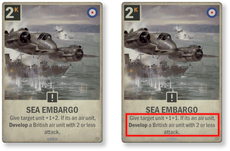First up is a slight nerf to Sea Embargo. Brit Air is one of the better decks hovering around and we want to lower its ceiling a bit. Sea Embargo is still playable after this, but offers less value, especially in the all important early turns.
