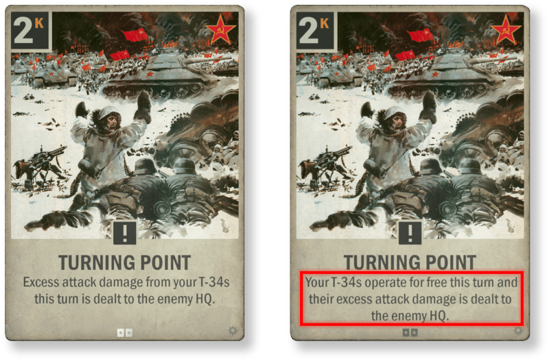 In a similar vein, here is another buff aimed to turn the fortunes of T-34 decks around. This one requires a more dedicated T-34 deck, but played at the right moment, this can take a win out of nowhere. Let’s see if this points the deck in the right direction.
