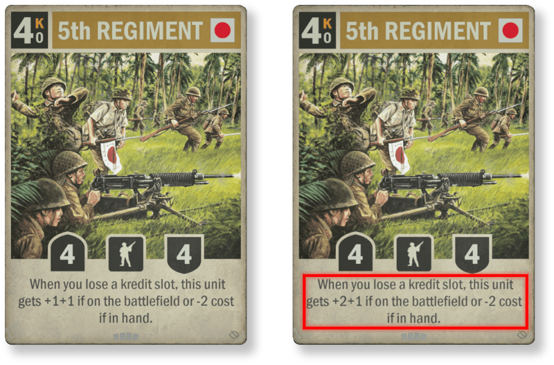 Speaking of decks that play out in a unique way, the SKD deck certainly fits the bill. It stormed out of the gates last summer, to the point where it was hit by several nerfs. The nerfs turned out to be a bit on the harsh side, so we are re-evaluing them a bit. We are not fully rolling back the nerf to the 5th Regiment, but increasing the ability to +2+1 is a significant buff all the same.