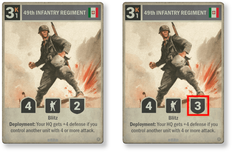 One of the themes of Blood & Iron was the 4-attack theme, with Italy in the thick of it. The 49th Infantry Regiment is borderline a strong candidate for that deck, but is lacking slightly. Now that it is sturdier, it will be interesting to see if it makes its way into more played decks.