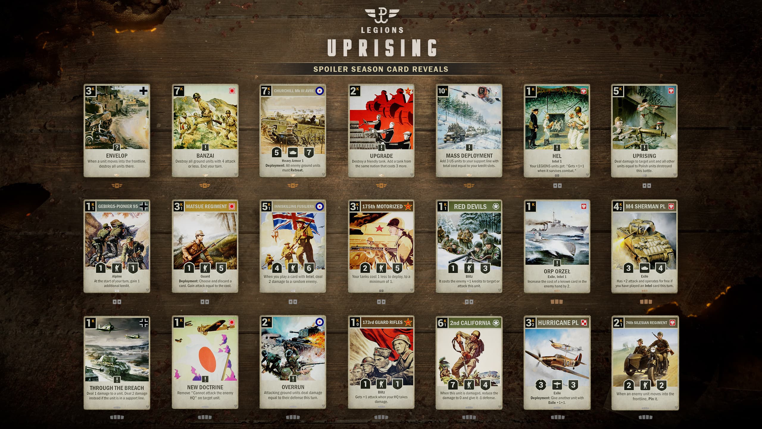 Uprising, the latest update to KARDS reinforces the Legions set with a total of 53 brand-new cards (21 unique). All major nations receive reinforcements of three new cards (one Elite, one Special, and one Standard rarity), the ally nation Poland is strengthened with six new cards.