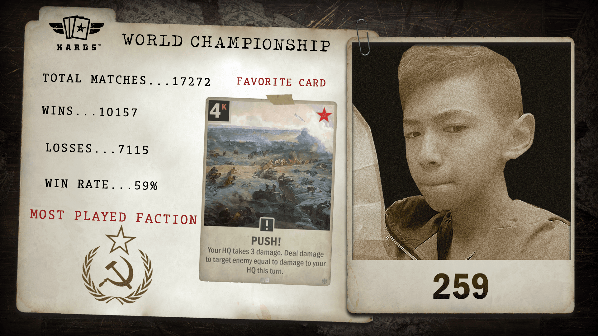 Another strong performer from the Blood & Iron Tournament, 259 has built an impressive record of over 10,000 victories in nearly 17,300 matches. Their sustained results and tournament success speak to a consistently high level of play.