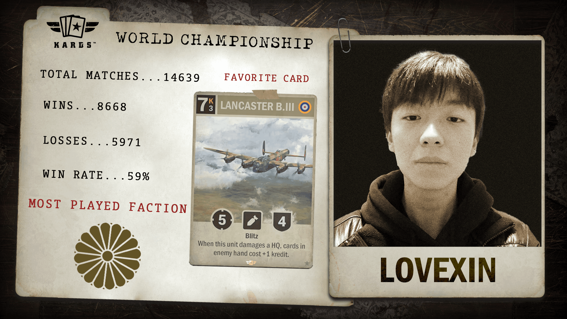 爱欣欣欣欣 (Lovexin) enters the finals with a solid record of 8,668 victories and a 59.2% win rate across more than 14,000 matches. Since starting their KARDS journey in September 2023, Lovexin has demonstrated consistent competitive form and steady progression through ranked and tournament play.