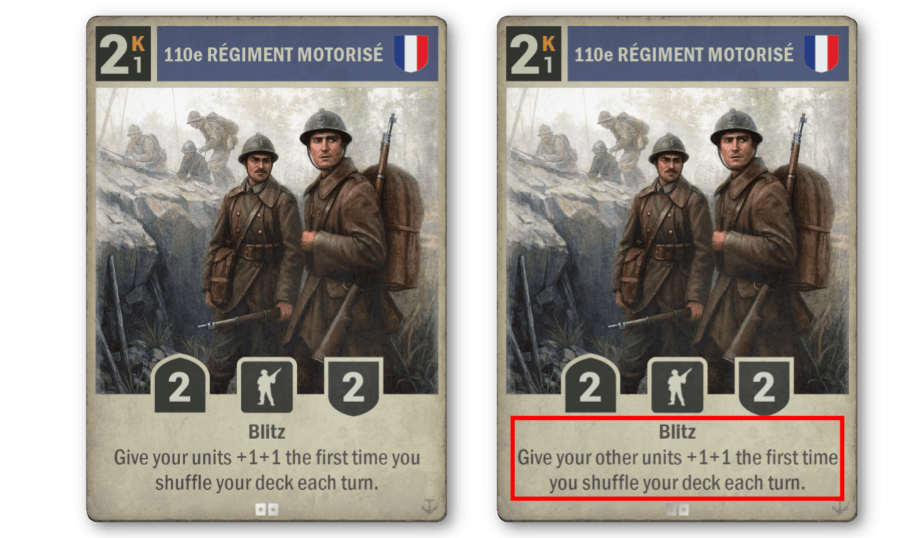 New: Blitz. Give your other units +1+1 the first time you shuffle your deck each turn.