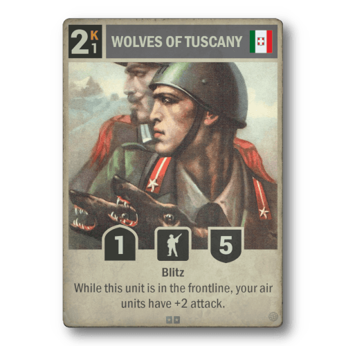An Italian Infantry unit of Special rarity that costs 2 kredits to deploy and 1 kredit to operate.