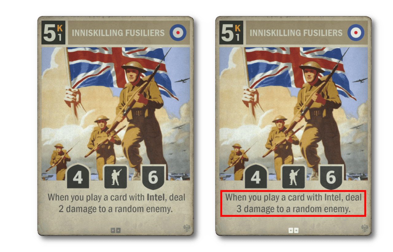 A habilidade em Fuzileiros Inniskilling está subindo de 2 para 3. A matemática nos diz que isso é um aumento de 50%, mas nossos instintos nos dizem que é bem maior, como uma torta de pastor digerida lentamente. Os baralhos Inteligência têm flertado com a respeitabilidade há um tempo, especialmente na legião com as Legiões. Agora tem uma carta de recompensa que exige respeito e, finalmente, coloca a matança em Inniskilling.