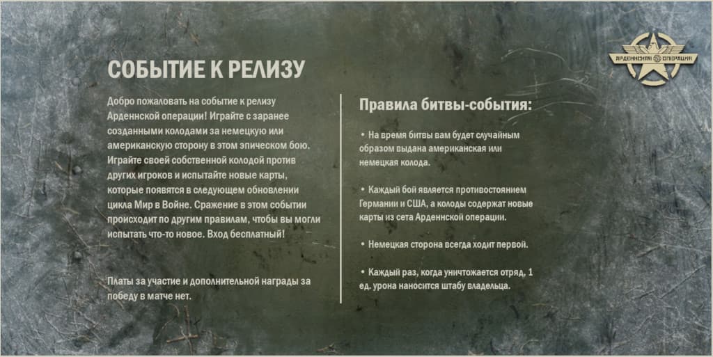 Это обновление представляет 7 новых карт, все из которых тематически оформлены вокруг Арденнской операции и позволяют улучшить существующие колоды или создать их новые варианты.