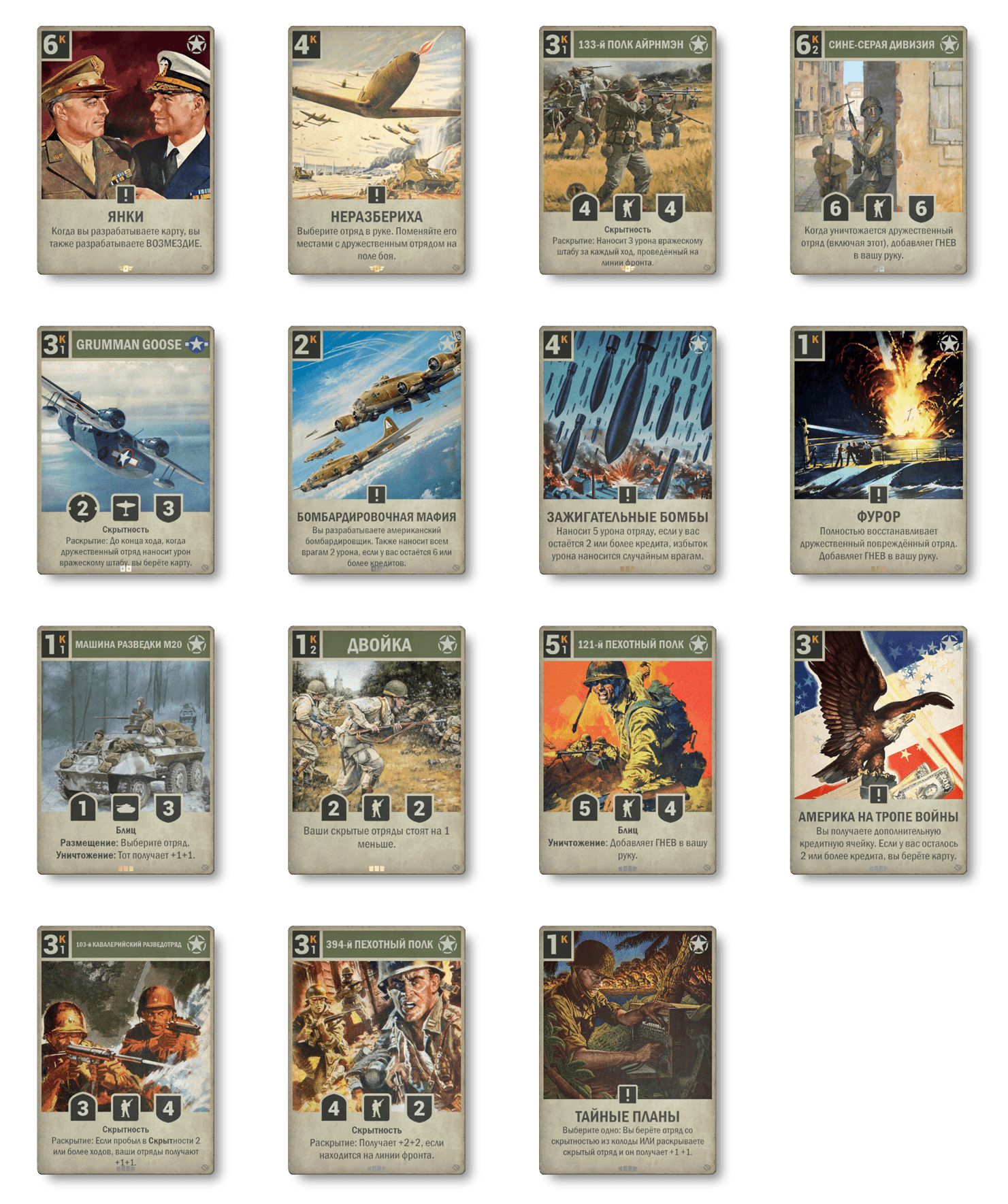 Скрытые отряды являются основной темой США в этом летнем расширении. Кроме того, страна получает Возмездие: 13 карт, доступных только из разработки или других карт.