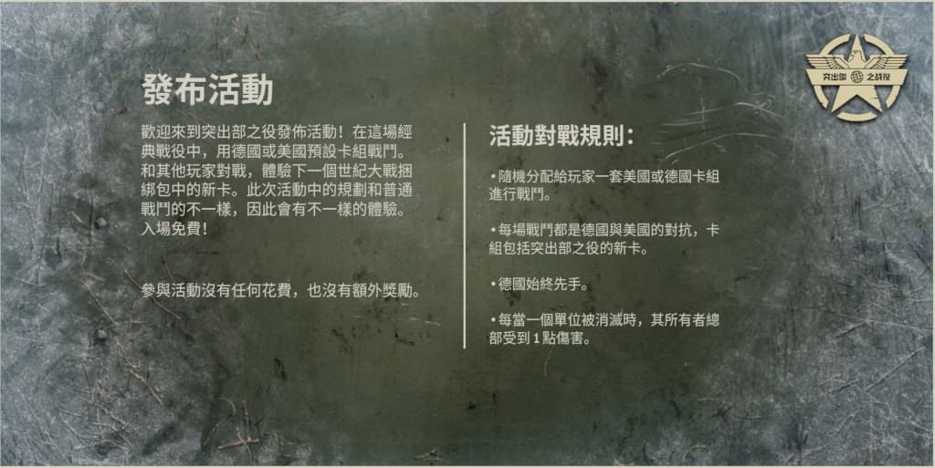 在這個活動中,玩家可以選擇德國或美國參加戰鬥,免費試用所有新的突出部之役新卡。