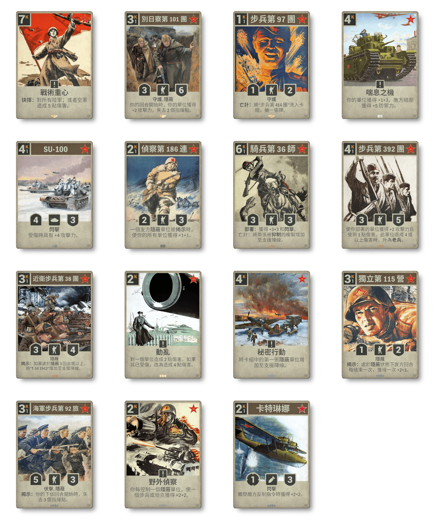 87 張全新可收藏卡牌已隨秘密行動入場。五個主國各獲得 15 張新卡:3 張精英,3 張特殊,4 張限定,5 張普通。此外,四個盟國各獲得 3 張新卡:1 張特殊、1 張限定以及 1 張普通。