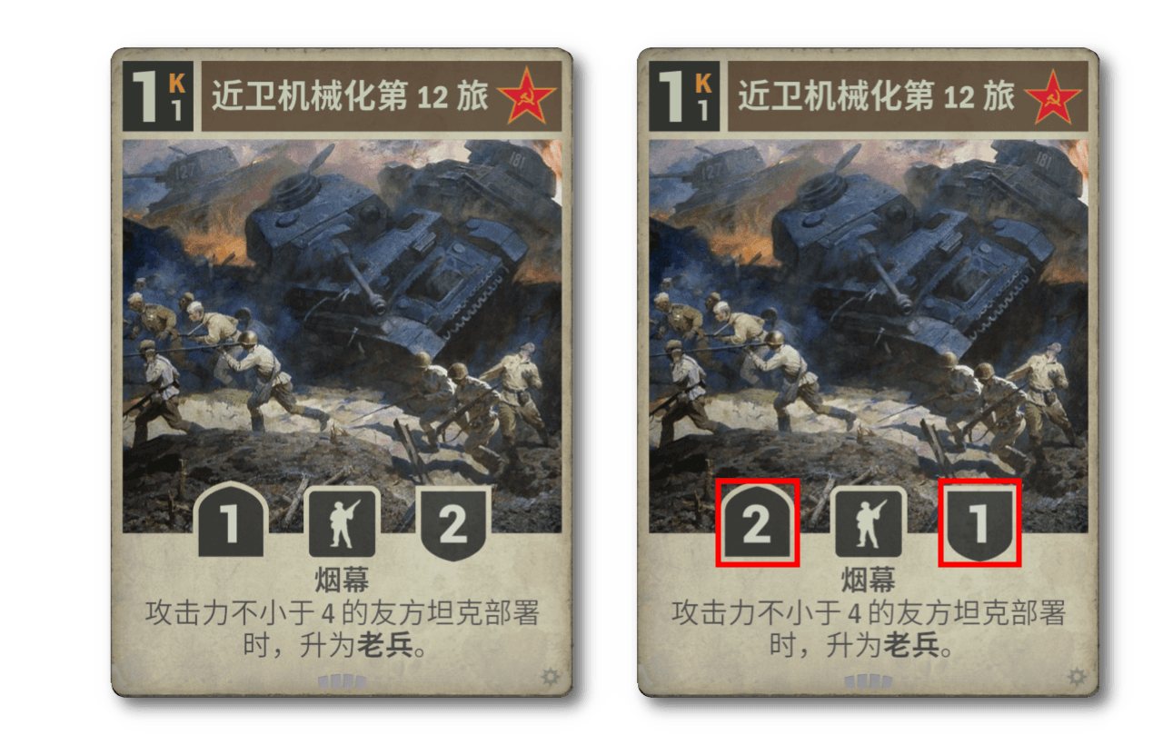 近衛機械化第 12 旅備受歡迎,如今高視闊步,意圖征服世界。它現在急於求成,貪功冒進,只顧進攻。我們要在遊戲中反映這種居功自傲的傾向,因此調換了非老兵版本的攻防。不過要注意,只有非老兵版本進行了調整,老兵仍舊穩紮穩打。