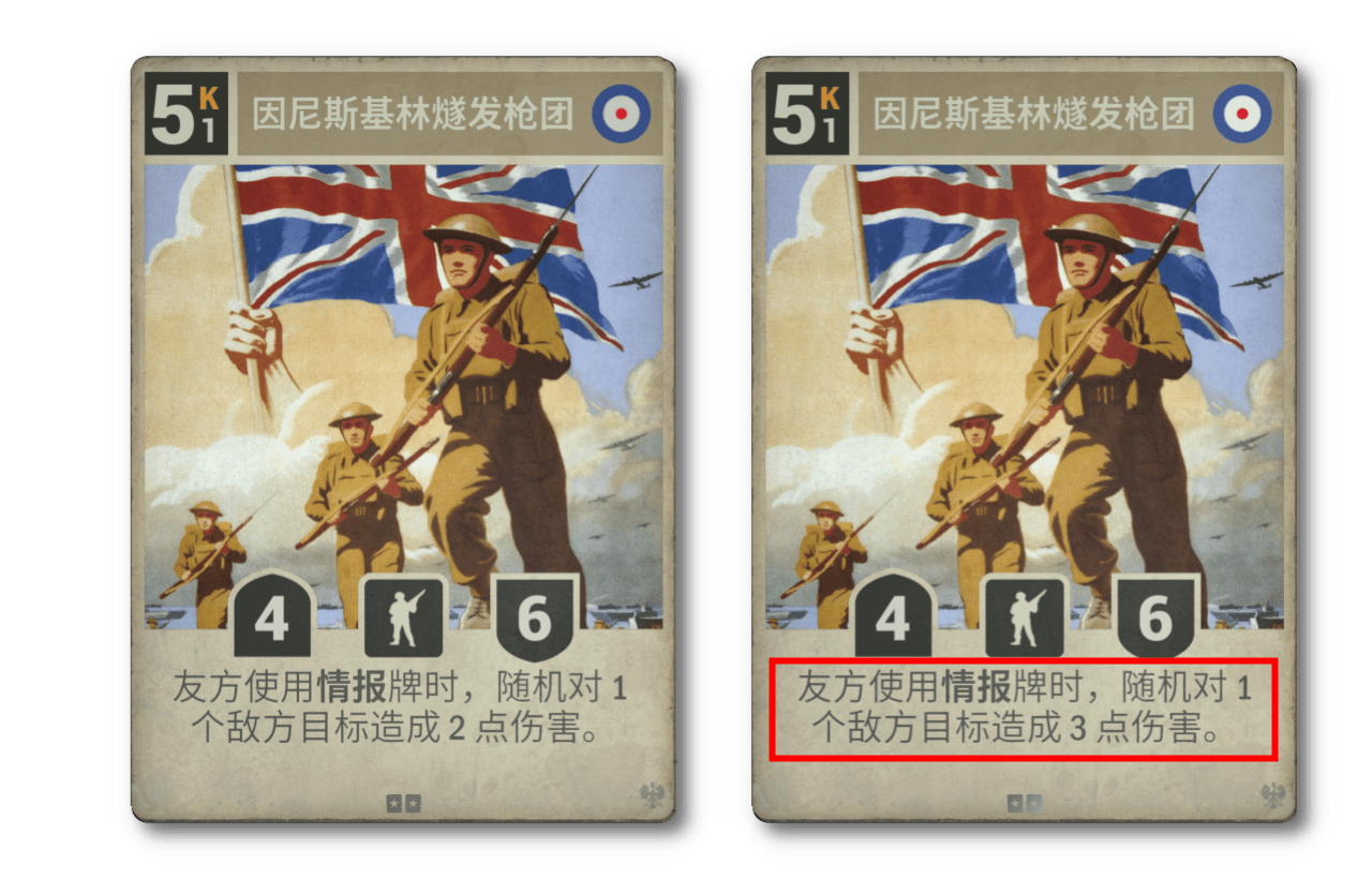 因尼斯基林燧發槍團的特效傷害從 2 點提高到了 3 點。數學告訴我們這增加了 50 %,但肚量告訴我們差別要大得多,就像慢慢消化的牧羊人派。長久以來,情報卡組並不怎麼受重視,只能和軍團抱團。現在它有了一張值得重視的收益牌,實現燧發槍擊殺。