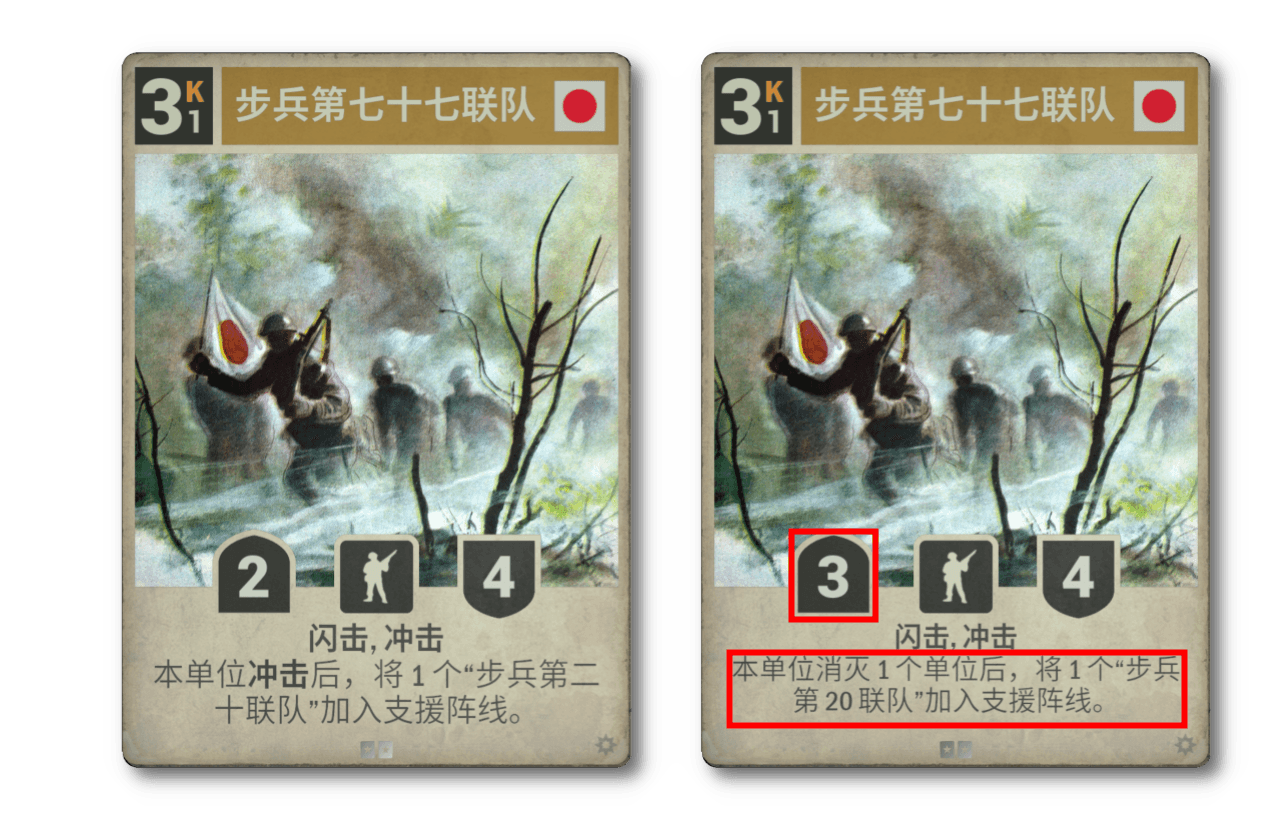 步兵第七十七聯隊,既不偉大,也不卑微,但它曾經只能出一個 2/2。如今它化身霧中惡鬼,低吼“更多 2/2”,必將震懾強敵。與冬聯隊等中速品質單位類似,七十七聯隊有望給日本帶來新風潮。