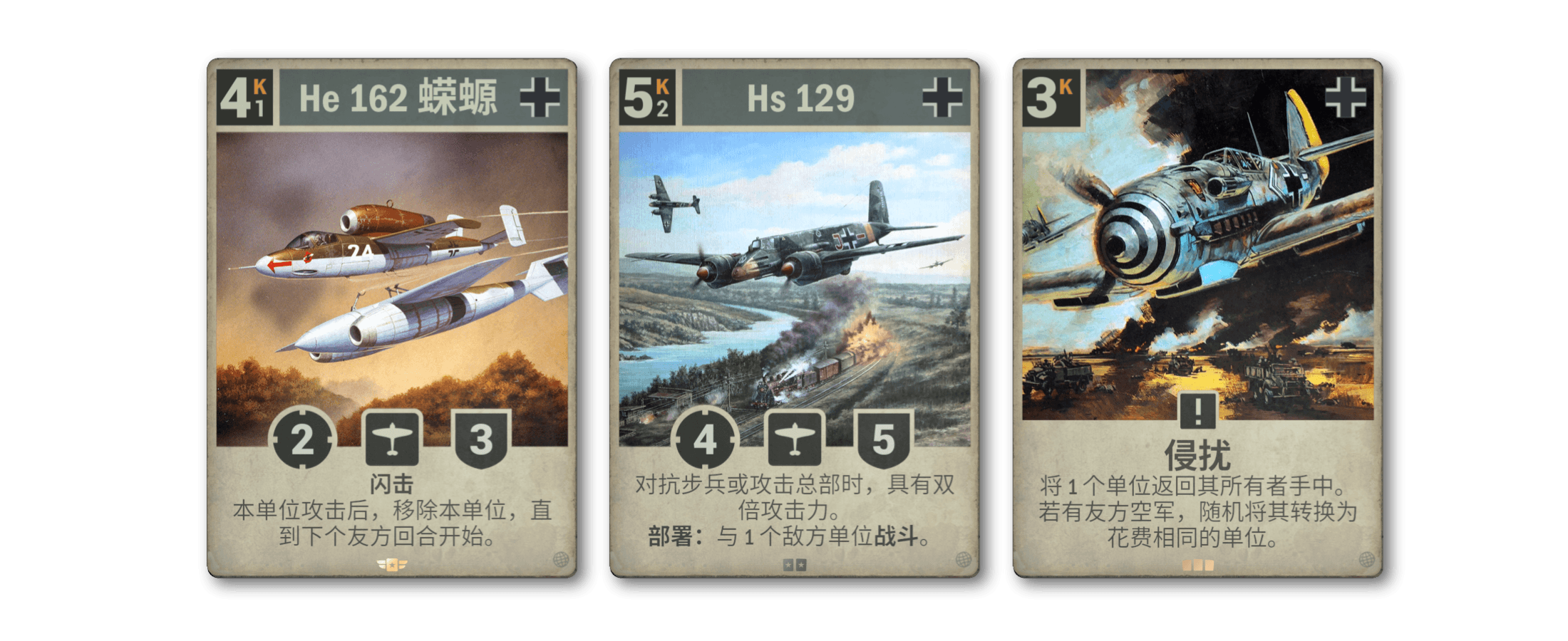 Hs 129(特殊)- 坦克杀手,擅长摧毁地面目标,能对陆军和总部造成双倍伤害,登场回合就能进行热战。