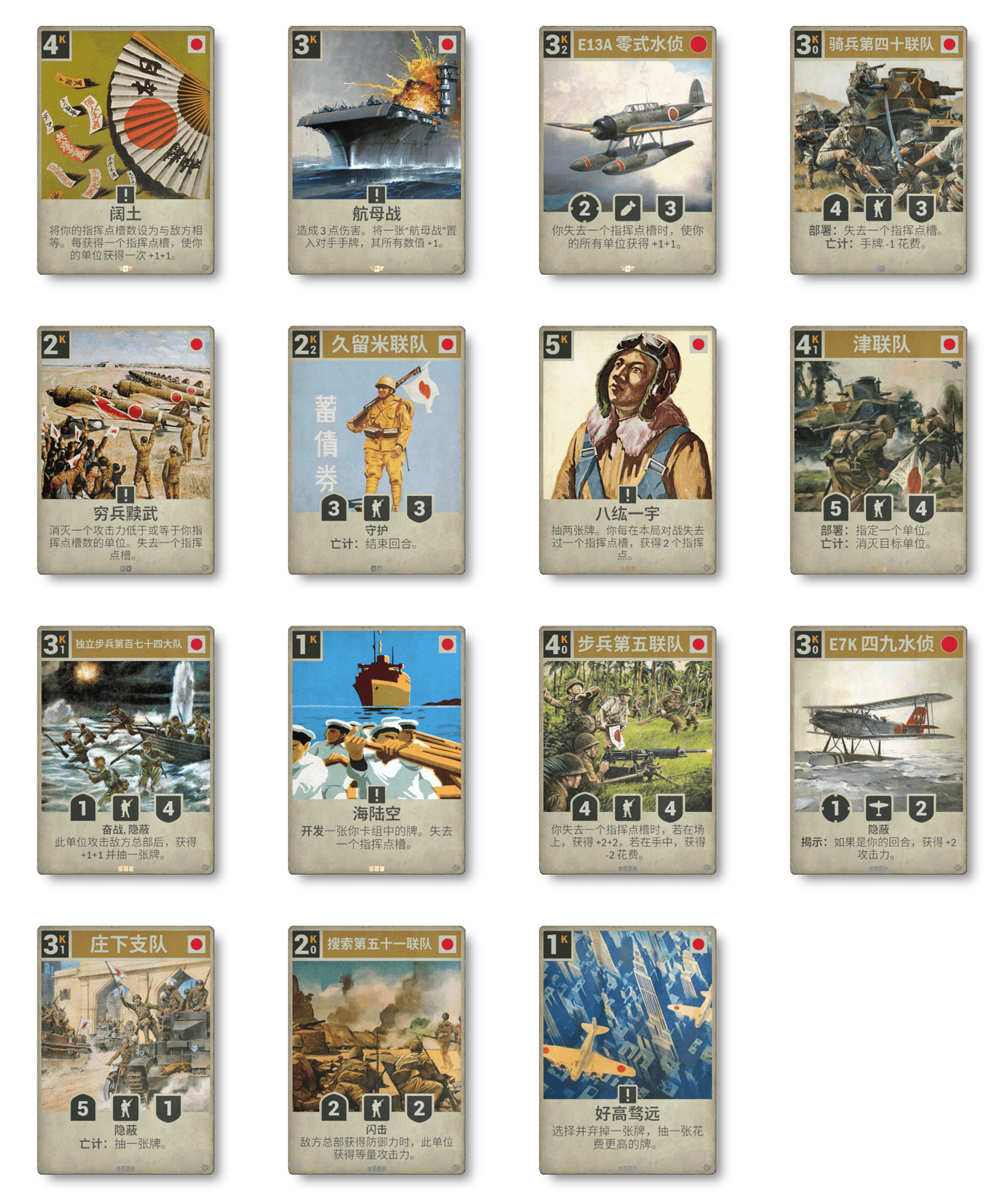 通过秘密行动,日本的战略武库得到了重大提升。几张新卡都围绕着牺牲指挥点槽来获得其他方面的收益,并希望借此带来胜利。这与日本在二战期间的主要战略完全一致。此外,我们还通过此版本加入了多张令人激动的隐蔽卡牌。