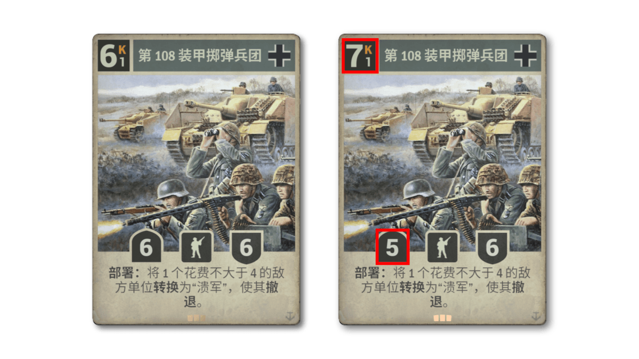 666 在西方文化中是不详数字,而第 108 装甲掷弹兵团正是 6 费 6/6。它能释放阴间的部署效果,仿佛恶鬼回魂,让人不寒而栗。我们已进行驱魔仪式,花费升至 7 点,攻击降至 5 点,净化数值,扫清邪恶。